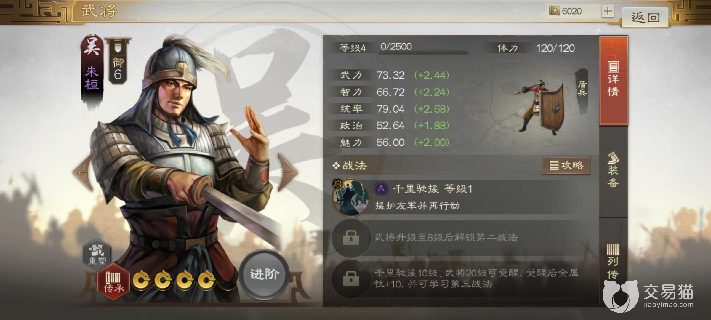 朱恒战法是千里驰援,释放后能够获得援护效果,可以对范围内的友军承受攻击,使用后并不影响本回合的行动,被动还能提高自身的统率属性。小编认为朱恒的效果和曹仁非常接近,完全可以在前期先代替曹仁,或者是组成双援护阵容,降低开荒时兵力的损耗。