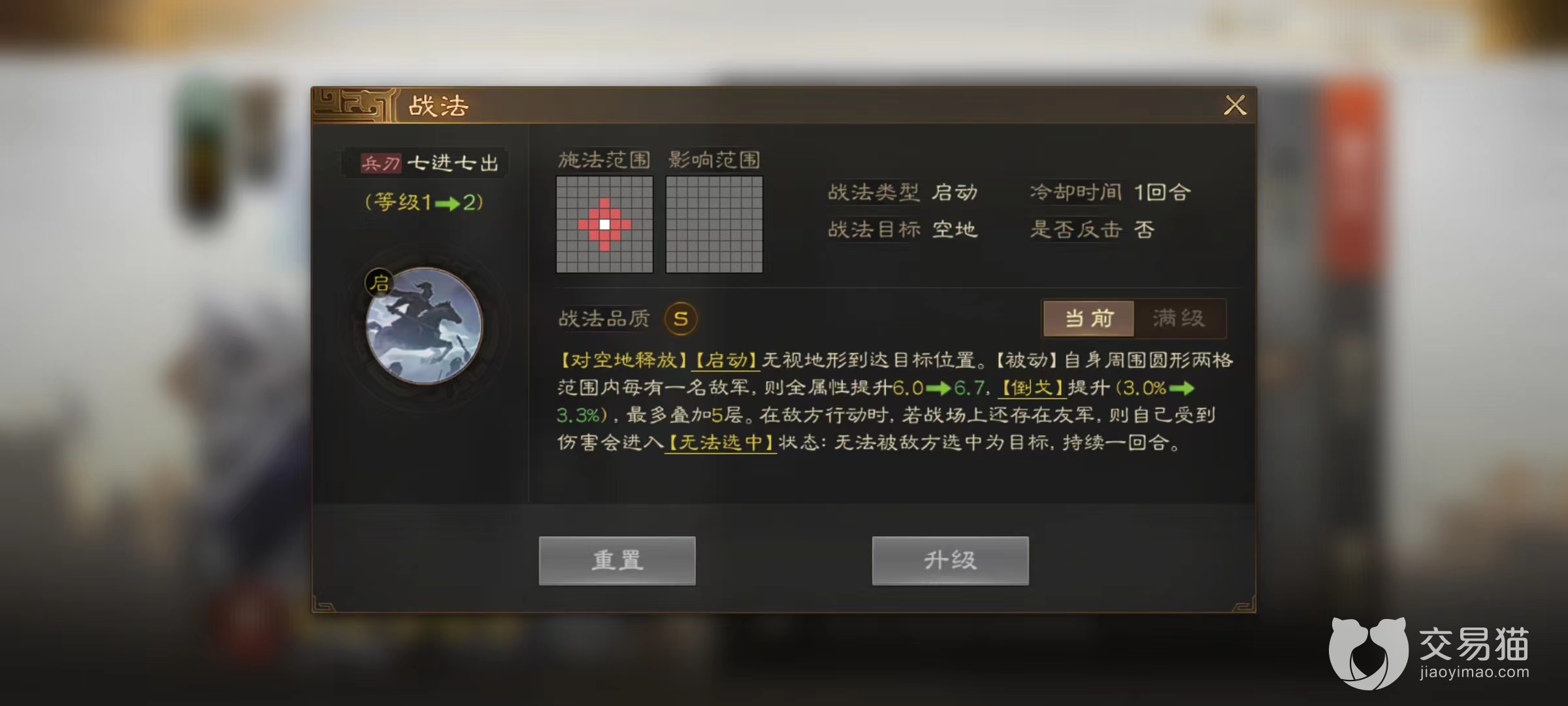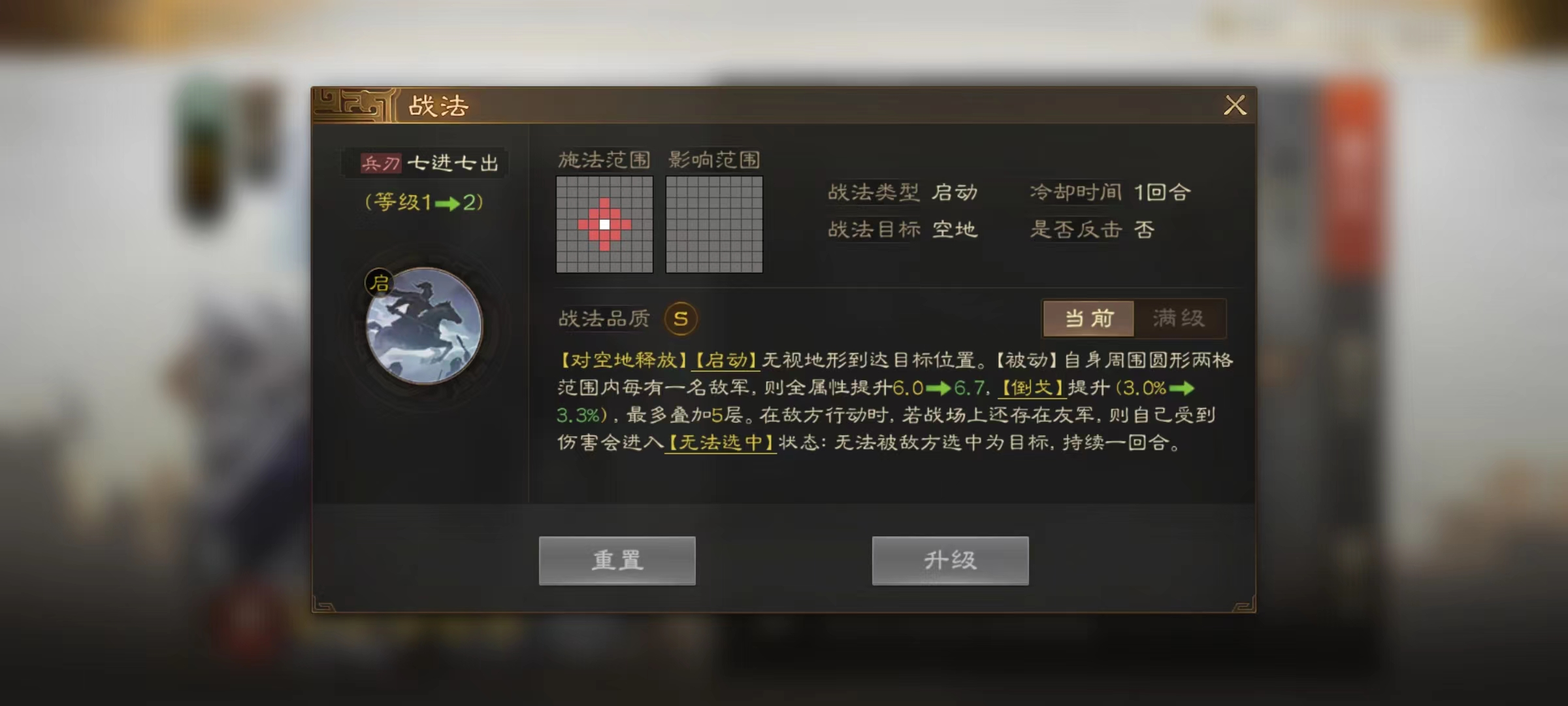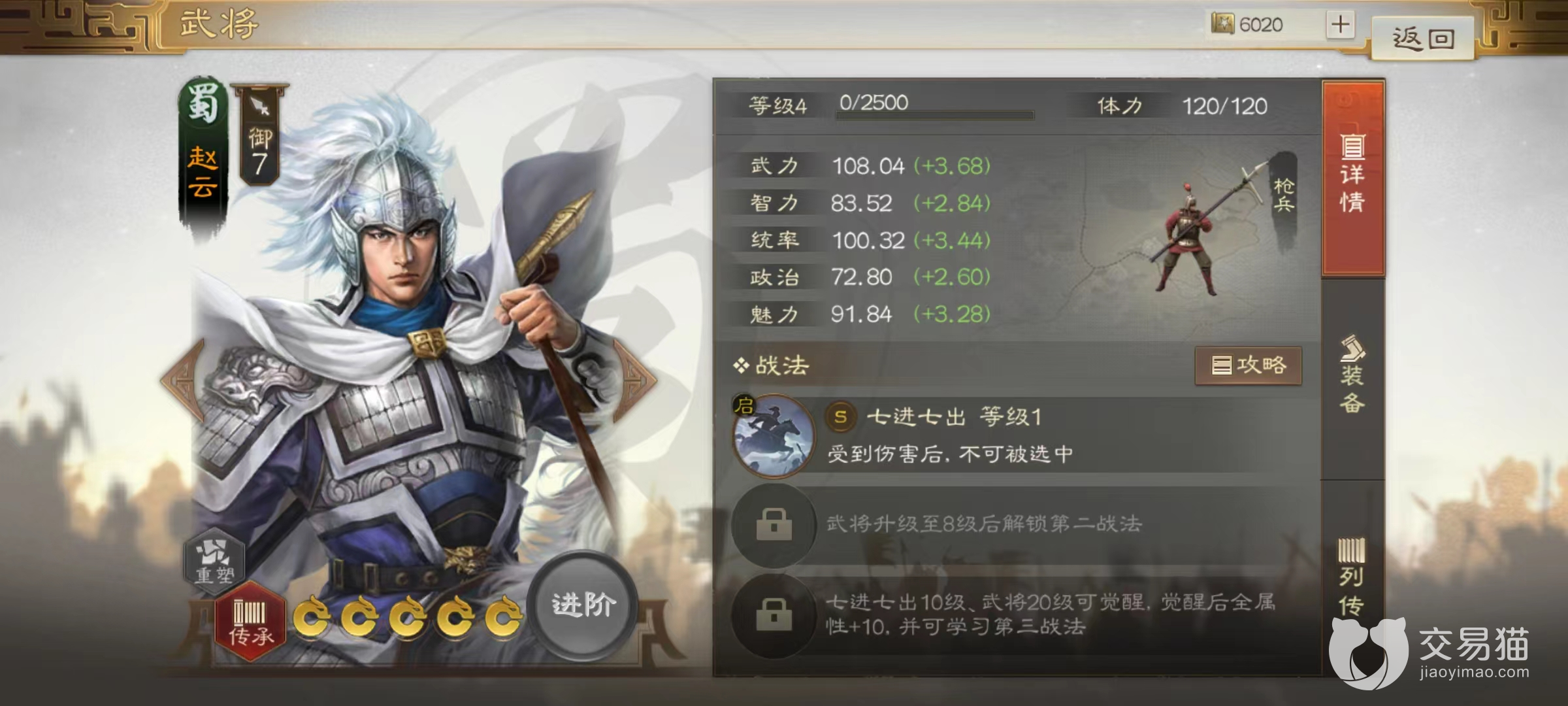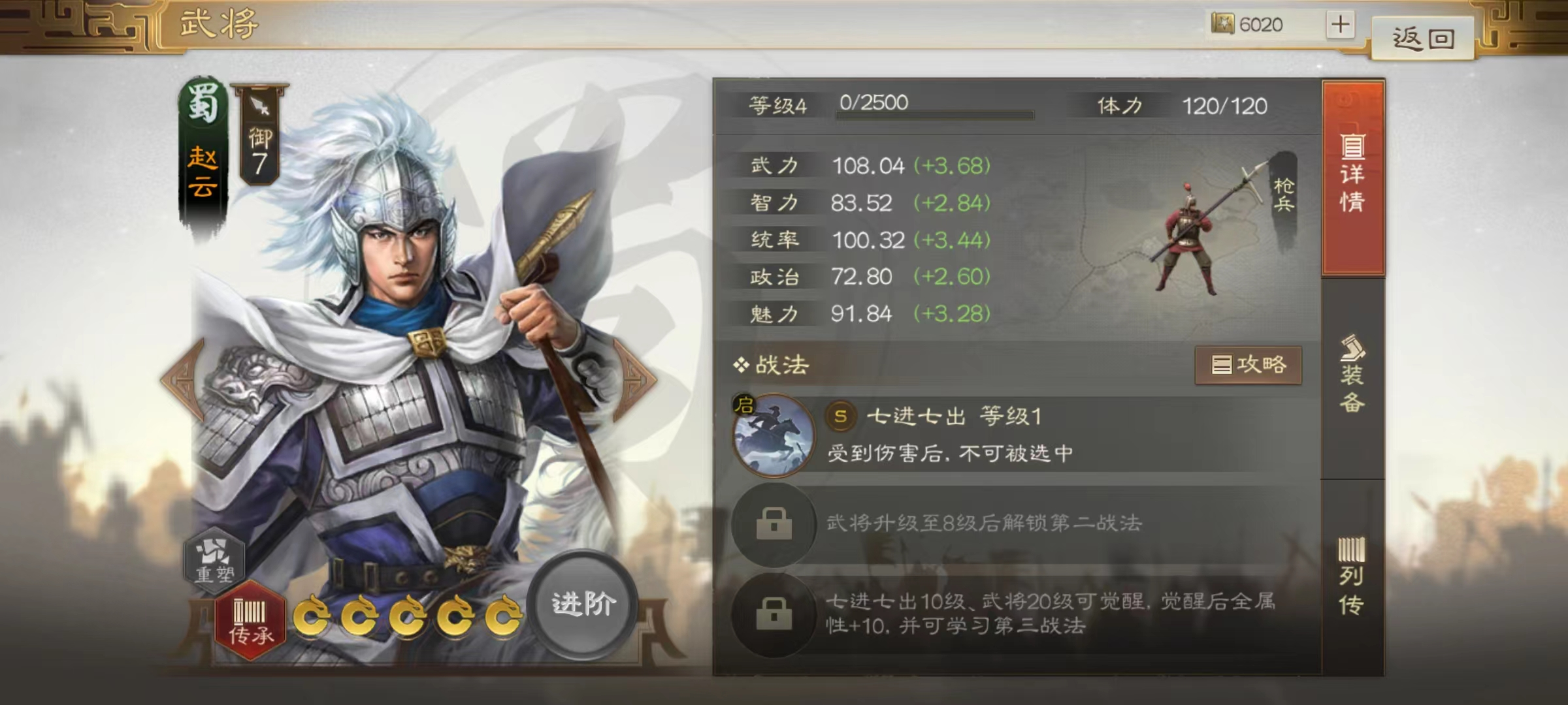 从赵云的面板属性来看,武力和统帅双双达到了超一流武将水准,这样就不用担心后期发展潜力的问题,拥有一个良好的基础。再加上自身属于枪兵型将领,天生就能造成额外伤害,这也奠定了赵云输出核心的地位。自身携带的战法七进七出更是非常强势,可以对战场中的空地使用无视周围的地形,直接到达目标位置。同时也有被动效果,当赵云身边两格范围内有敌方目标时,可以提高自身全属性并且获得倒戈状态,敌方目标越多属性提升越高,倒戈状态的层数也在继续叠加,最多能够到5层。