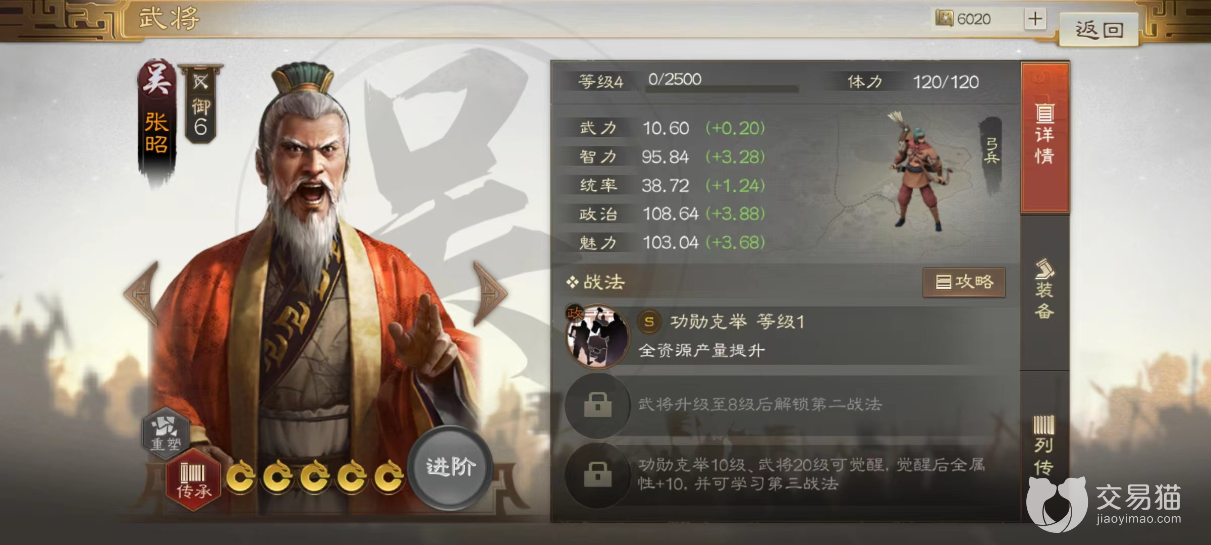 作为一名内政型武将,张昭自然无法出战进行战斗,虽然拥有不错的智力初始值和成长,但是自身战法受到限制,所以几乎没有玩家利用他去战场作战。但这并不意味着这名武将没有价值,相反在很多方面张昭都有独特的用处,首先是自己的战法功勋克举,这是内政中非常有用的一项内容。当被委任为主政官时,所有资源的产量都将获得提升,达到满级时资源的产量提升为2.5%。看似并不高的变化,但是累积下来是非常恐怖的资源量,尤其在后期更是必不可少的内政型官员。