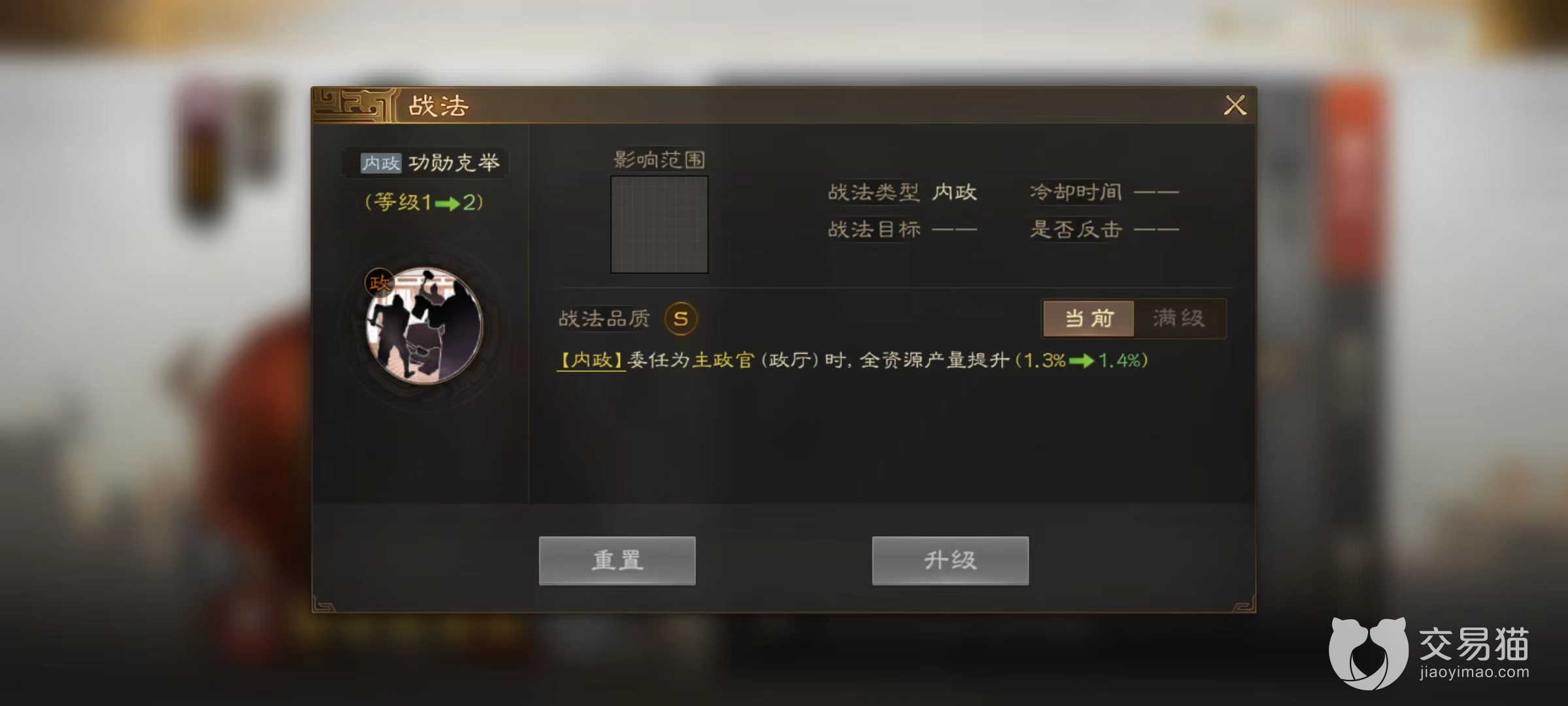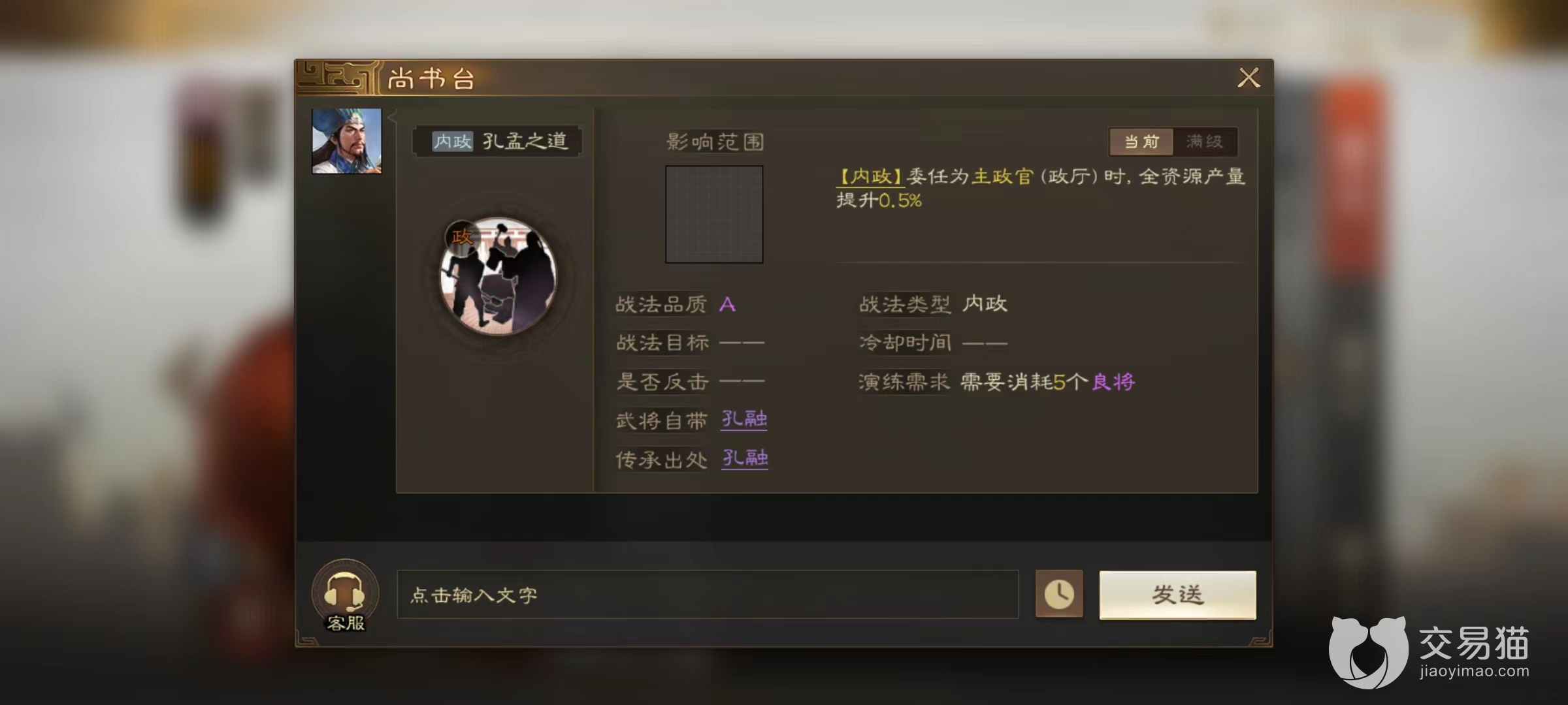 为了进一步强化在内政中的重要性,张昭的另外两个战法可以选择孔孟之道和奉迎天子,孔孟之道使得成为主政官时全资源产量再次提升1%,这样张昭就拥有了3.5%的资源加成。奉迎天子的效果是提高所有委任官员的政治属性,也就相当于将所有的内政效果再次进行加成。所以获得张昭之后,马上要打开主城将它放到执政官的位置上去发光发热。