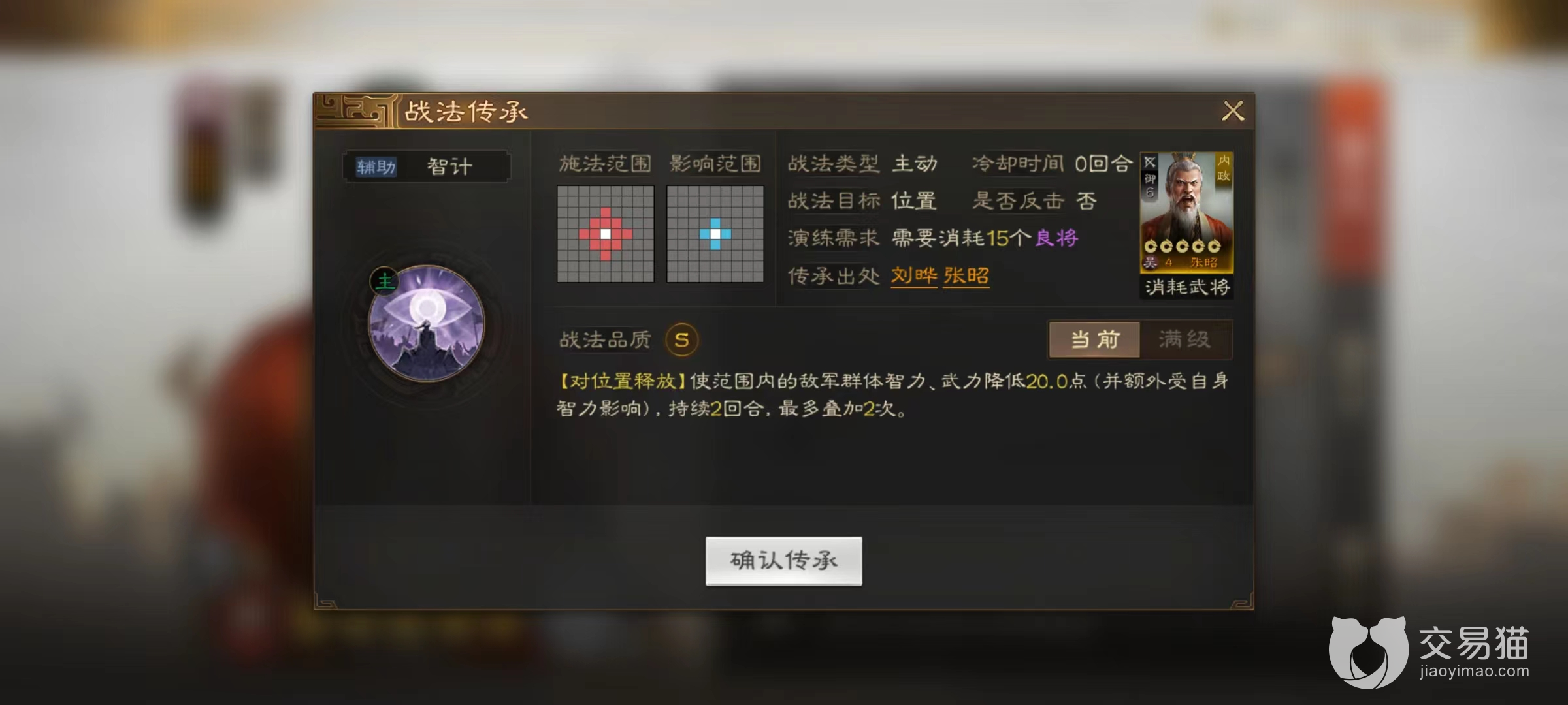 当然他的作用远不止于此,毕竟作为主政官有一张卡牌就够,如果再次获得张昭就可以将他分解掉获得传承战法。张昭的传承战法智计,是非常好用的S级主动型战法,使用之后对范围内的敌方群体目标造成降低智力和武力的效果,并且可以叠加两次。当战法达到满级时,两次能够降低80点,已经是非常可观的数值。很多智力型的武将都会选择这一战法作为自己的补充,作用很大。