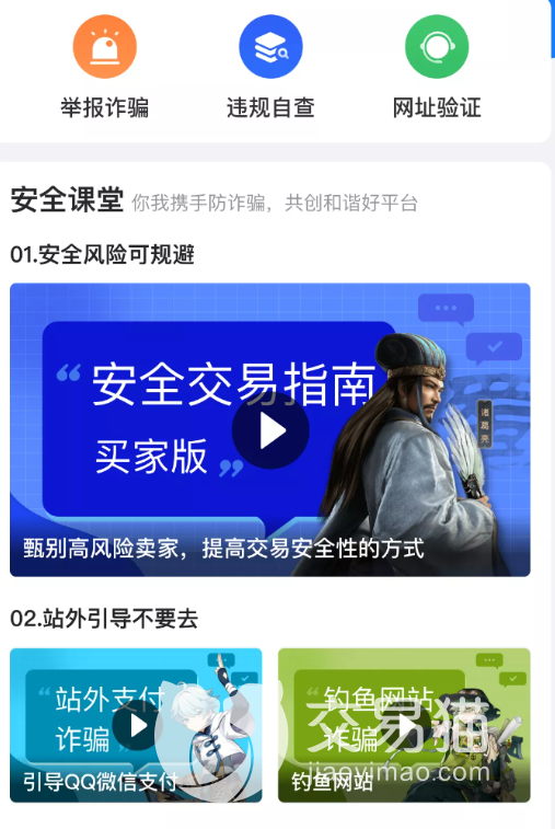 一些小伙伴可能在交易完成后遭到账号异常或被找回的情况,这时大家可以点击交易猫主页“我的”,然后点进其中的安全中心,举报能够受理的方面还是很多的,而且售后客服这边也有不错的效率和态度。然后安全课堂也会不断收纳一些常见问题,从而让您提前学习经验,来预防可能产生的风险。
