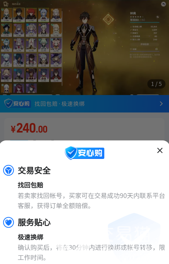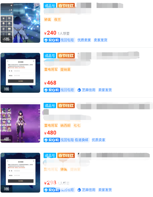 那么以上就是“原神新手买号买哪个角色”的全部内容,相信大家看完后对这个问题也有了答案,总之还是最推荐大家买甘雨和雷电将军,而拥有这些优质角色的账号,在“交易猫”上都有着大量储备,所以各位赶紧下载使用它吧!