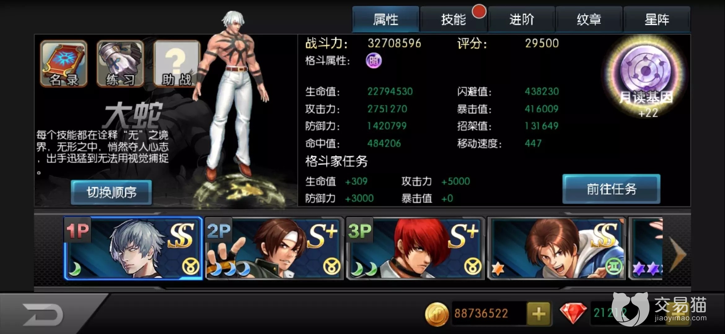 玩拳皇讲究的就是当初一起坐在大头电脑面前共用统一键盘疯狂敲击,网页版的拳皇绝对可以看成上一代经典,而由snk正版授权的手游拳皇97ol也获得了不少玩家的青睐。小伙伴们都想知道拳皇97ol账号交易平台推荐哪个号,大家都想买个账号体验一下除了草薙京和八神之外的其他角色,如果自己不打算无脑氪金的话就只能在交易猫内买个账号了。