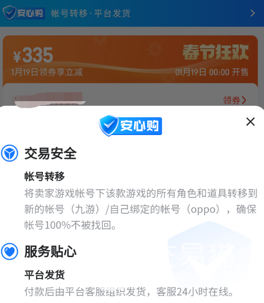 交易猫除了会在您商品的页面为买家展示游戏内道具图片以外,还会展示出附带的服务其中就包括部分端口所支持的账号转移服务,该服务将省去换绑流程,大大提升了交易的安全性,从而获取买家信任使得他愿意下单,另外这项服务对您也是十分便捷的,不用再费心费力等待与买家的协调,换绑过程可直接迅速完成,而且交易时的整个过程也都全由平台负责发货,让您得以更加安心。