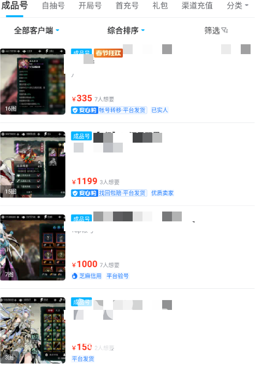 目前影之刃3的端口不只一个,在交易猫上,多个端口的账号都是支持交易的,而且目前该游戏在交易猫上的行情是十分不错的,如果您的账号质量本身过硬,那么很容易就能在平台上售出上千块的价格,如果质量较为一般,也仍然是有不错市场的,这点从上图中两个百元号也仍然有不少人表达出想要意愿就能看出。