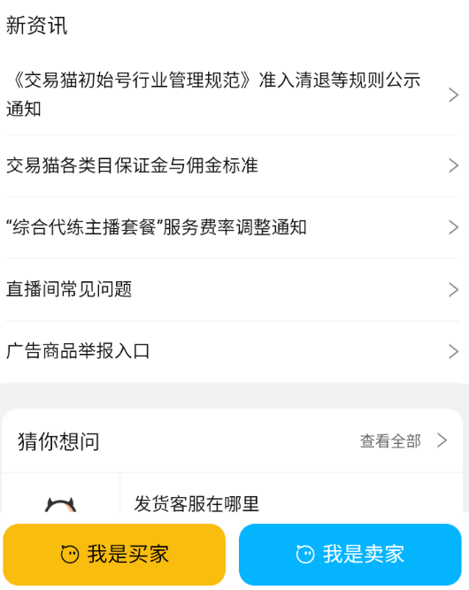 在交易猫主页“我的”界面点击“联系客服”即可进入一个汇集了诸多资讯与待选问题的界面,其中的资讯更新的都很及时,您可以借此第一时间了解平台的最新规则,待选问题的话,则会收录一些交易过程的常见问题,您有什么疑问也能从中寻找答案,如果实在是没有相应的回答,还能点击下方“我是卖家”联系在线客服解答。