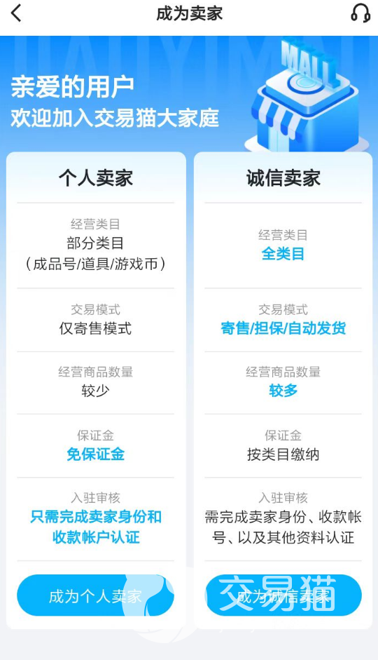 3、当各位正确的得到了适合自己的游戏号交易价格时,大家也可以考虑在交易猫app内开通一个卖家身份。该身份主要帮助各位在日后准备出售游戏号的时刻,直接将账号发布在交易猫app内进行处理。