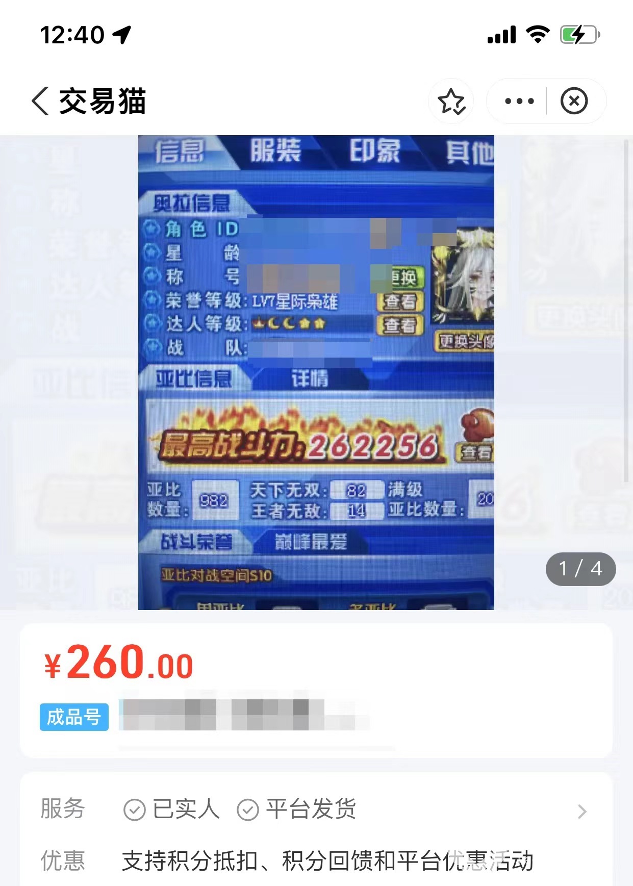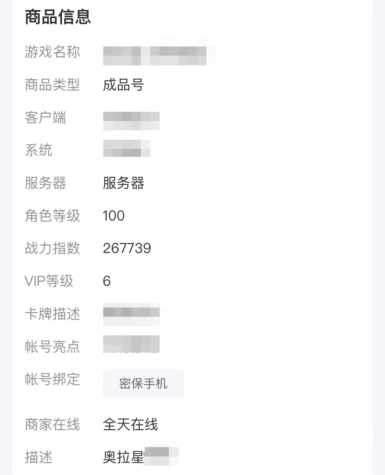 想要更多的了解商品的详情,只需要点击账号窗口,就可以看到卖家对于账号的详细说明了。不仅有多张图片的介绍,还有商品的补充说明,其中包括商品类型、客户端、系统、角色等级、账号绑定等买家非常关注的问题。