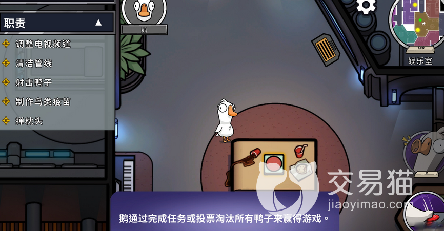 进入游戏之后,我们可以看到分别有鹅、鸭和鸟这三种动物,分别代表这不同的阵营。像大鹅就是平民,只要做完任务,或者是存活下来,就能够赢得胜利。鸭子的话,则是带刀坏人,需要将一切的大鹅和鸟类都刀光,才能够走到最后。其中还有一个中立阵营,他们都是独立的存在,有着特定的任务需要完成,只要能够达到目标,就能够取得最终的胜利。