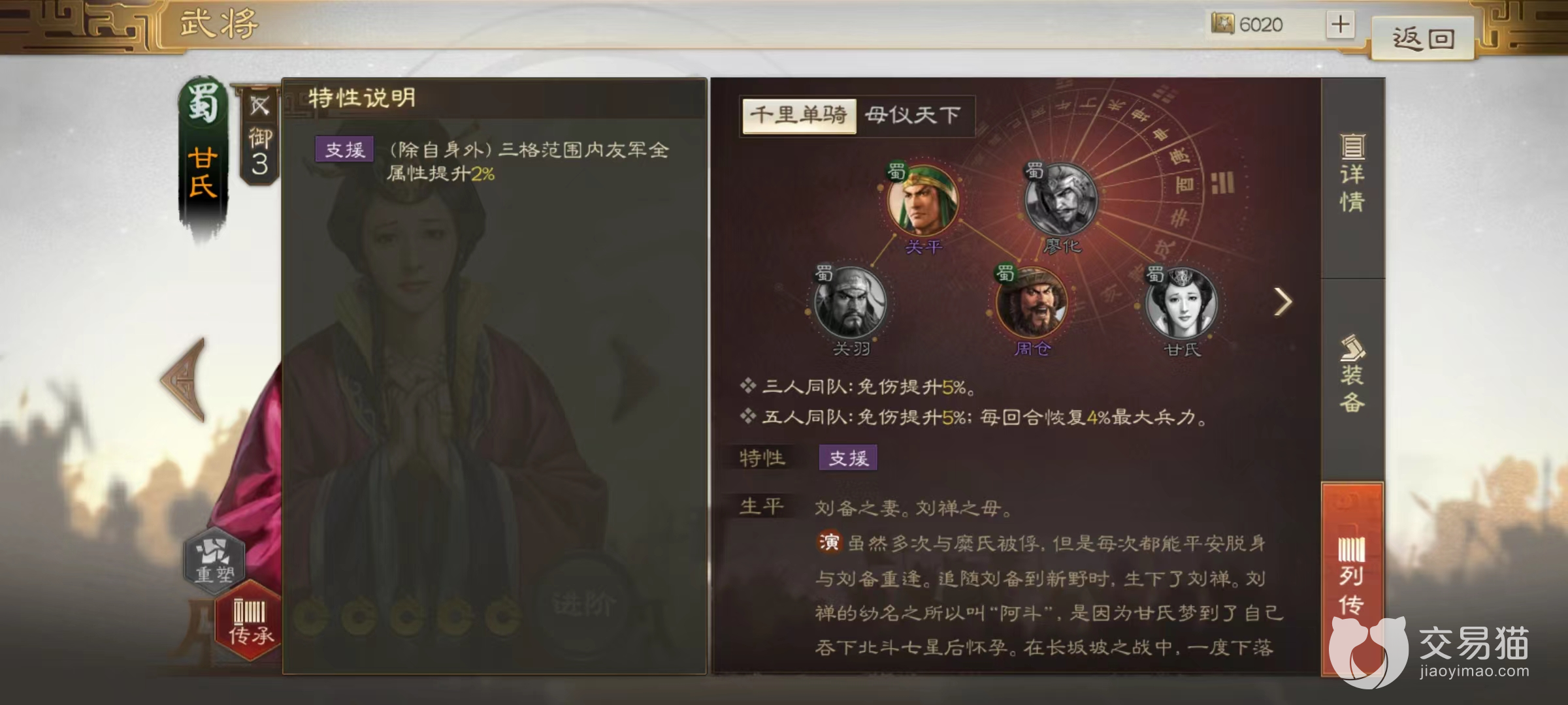 甘氏属于刘备之妻,在三国前期其实有过很多次出场,在游戏中被设计成了蜀国橙色将领,有一项很重要的地方就是自身只需要三点统御值就能出战。这是一项很大优势,相比于其他动辄需要6、7点的角色,在前期就能作为主力加入到阵容中为其他武将节省出空间。