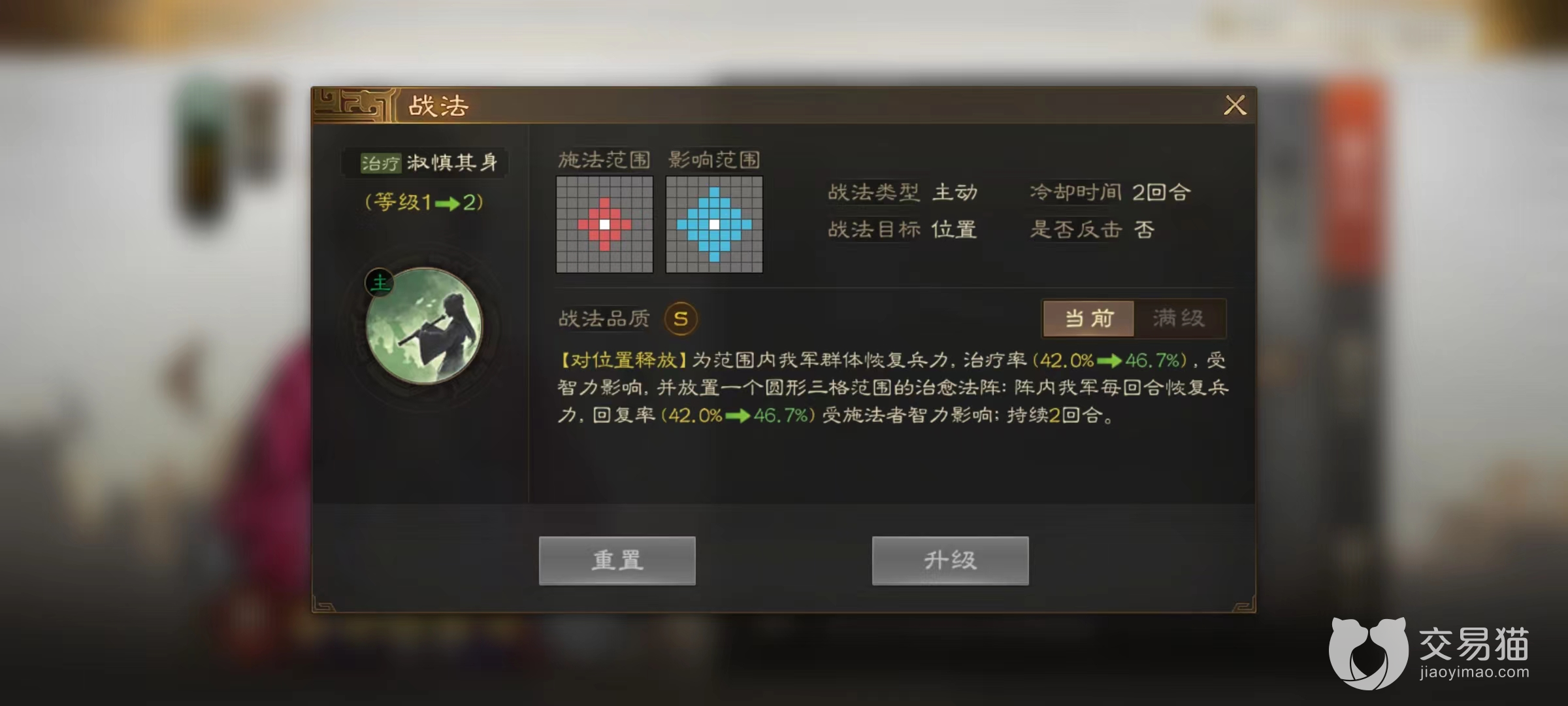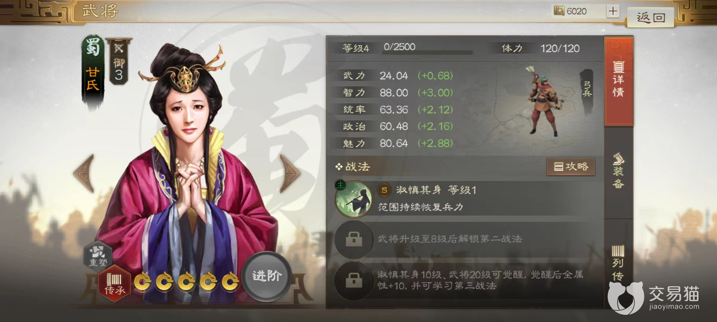 在属性上确实没有太多亮点,唯一可以使用的就是智力,不过战法却让人眼前一亮,效果是能够为大范围内我军武将恢复兵力。同时放置一个持续生效法阵,只要站在阵中我方武将就能在每回合持续恢复兵力。当此技能达到满级时,治疗率能够达到84%,再加上不错的智力属性,甘氏也能成为一流的治疗型角色。毕竟游戏中能够持续生效的治疗技能太少,这样不占用回合的效果,使用起来非常方便。尤其是加入战争早,前期开荒阶段显著降低兵力损耗,帮助玩家更快攻略高级土地。