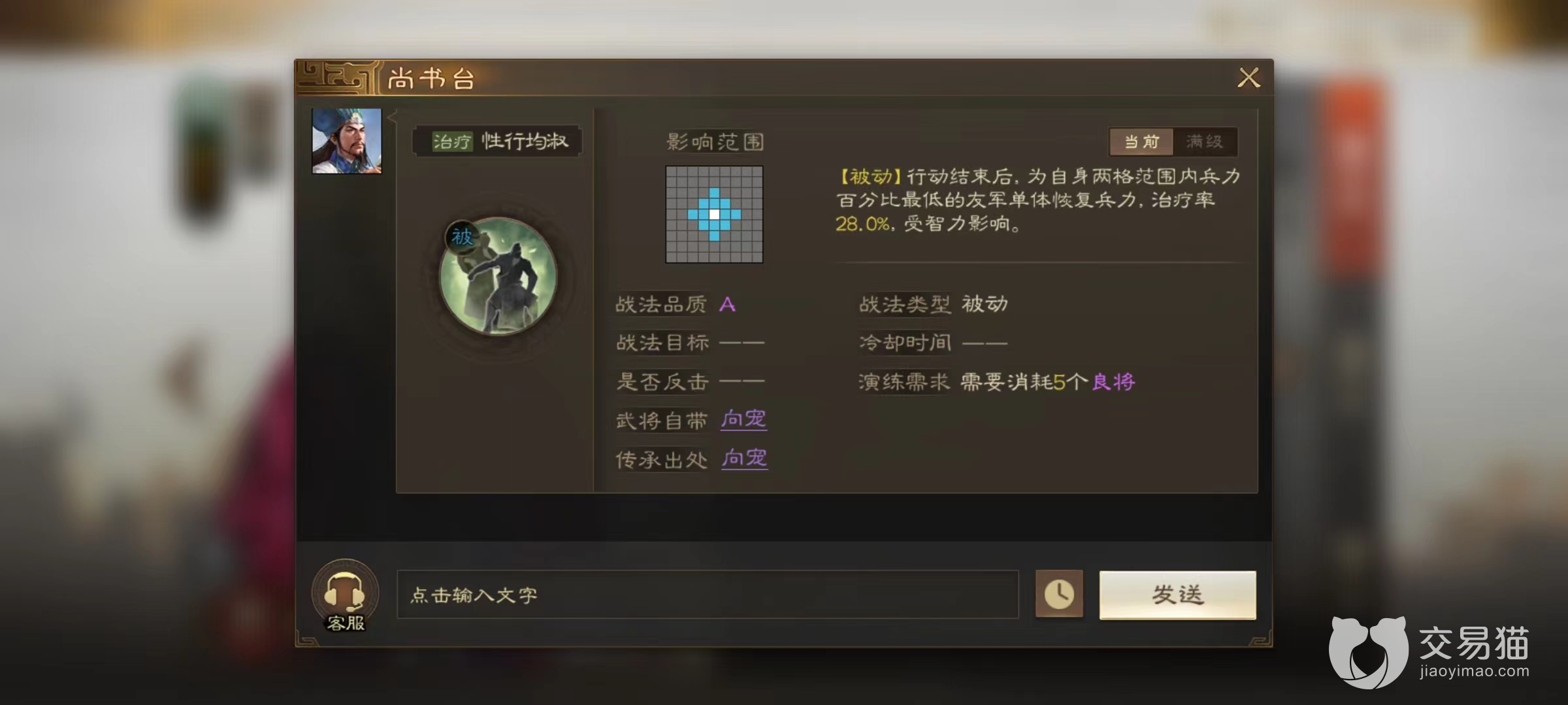 在其他战法搭配上,自然以辅助为主,小编推荐在前期可以选择性行均淑和长者之风这两个紫色战法,毕竟不属于核心主力,橙色战法只能等到后面再添加。这两个虽然品级不高不过非常适合使用,性行均淑可以在自身行动结束后再次为范围内友军恢复兵力,不占用出手回合。另一个长者之风能够为周围大范围内我军群体武将提高武力和智力,达到满级时能有21点提升,也是非常不错的增强效果。这样搭配下来就能够在中前期一直发挥作用。如果能配上橙色技能后期也可以当做治疗使用。