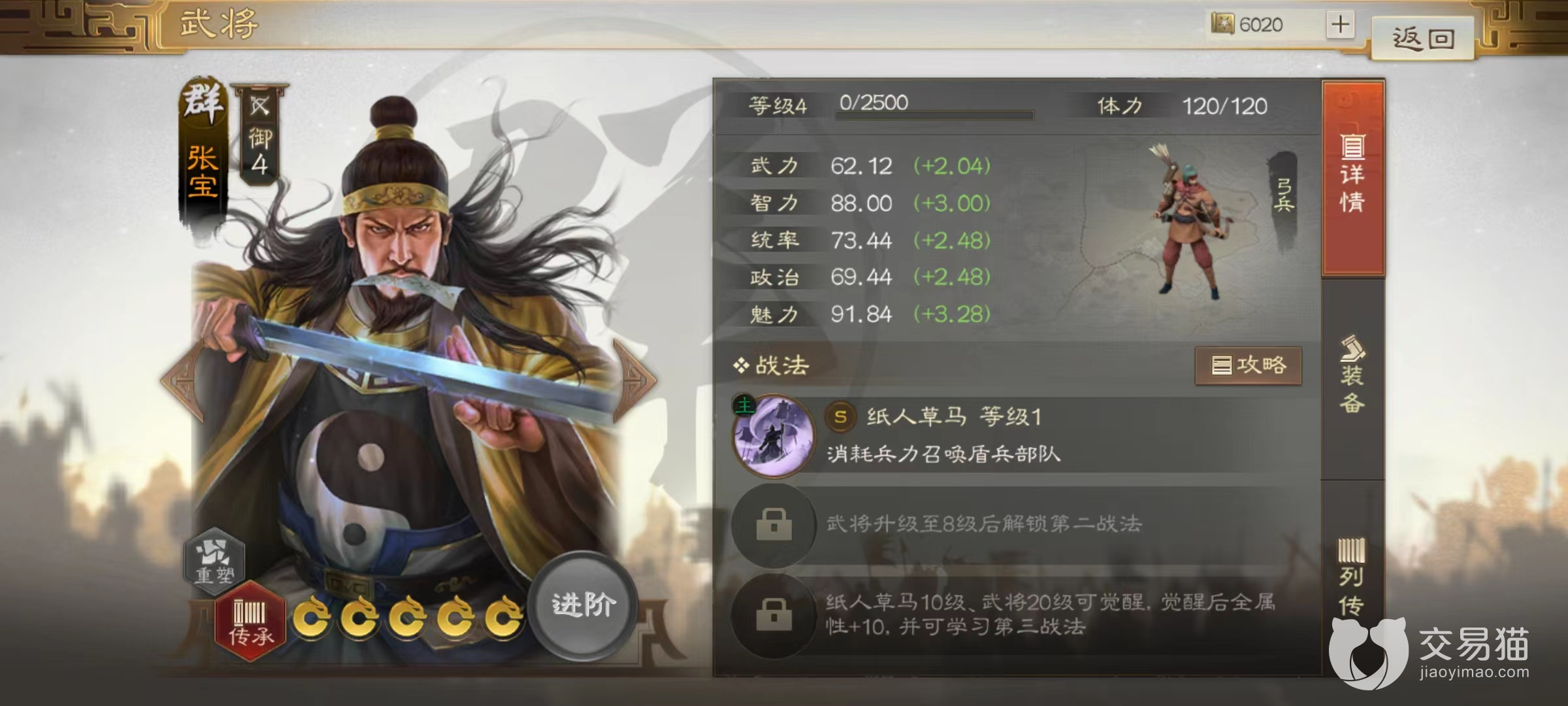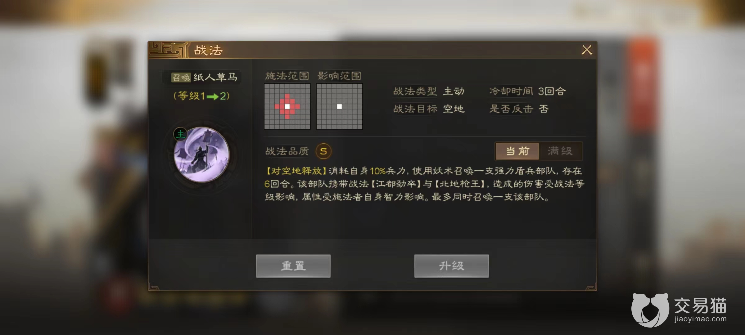 从面板属性中来看属于弓兵型将领,这样也就有了主动战法伤害加成和射程比较远优势。这些在一定程度上弥补了其智力属性不高问题。虽然智力初始值和成长都属于中等程度,但有了这一项加成在输出方面也并不落后。自带战法纸人草马,小编非常喜欢这一个战法,在释放时候选中一块空地,以消耗自身兵力为代价召唤出一只强力盾兵部队,此部队将会存在6个回合。并非只能进行普通攻击,还拥有江都劲卒和北地枪王这两个技能。战法等级越高则召唤出来纸人草马造成伤害也就越高,同时只能召唤出一支部队。