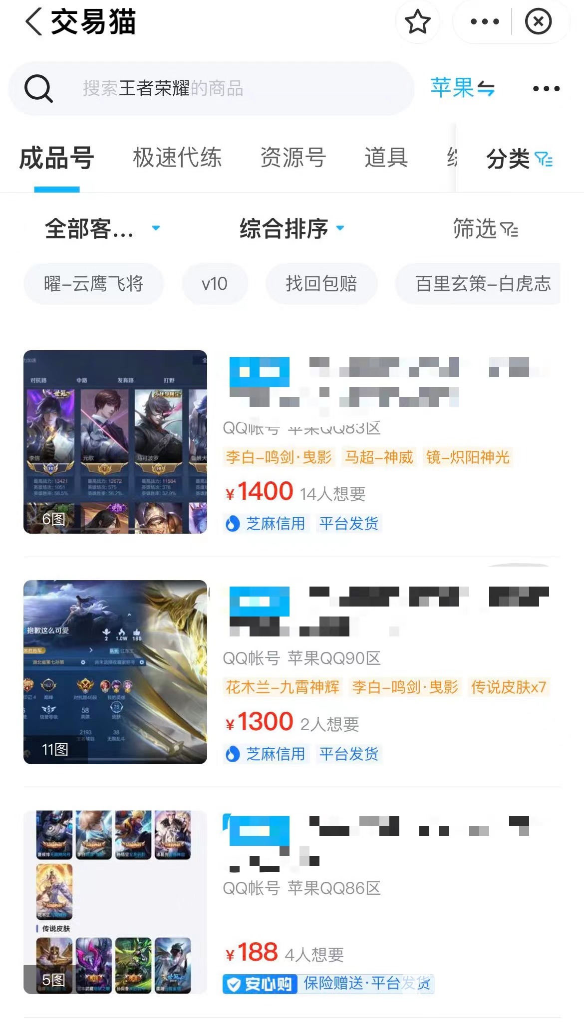 首先,玩家进入平台,搜索王者荣耀,里面有很多账号商品,包含资源号、道具等可以,大家可以货比三家择优选择。此外玩家可以选择各种服务器:微信、qq等,完全能够各取所需。