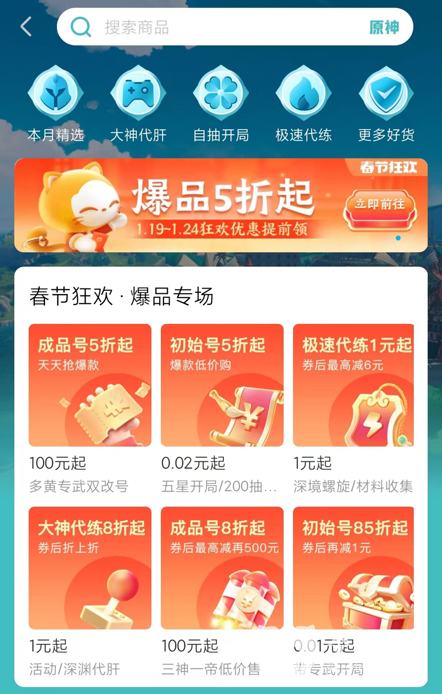 交易猫针对原神这一热门游戏,在购买账号时可以看到有春节狂欢的活动,在活动期间各种爆款产品都是五折起购哦,还有代练折扣,心动的小伙伴还不赶紧行动起来吗?