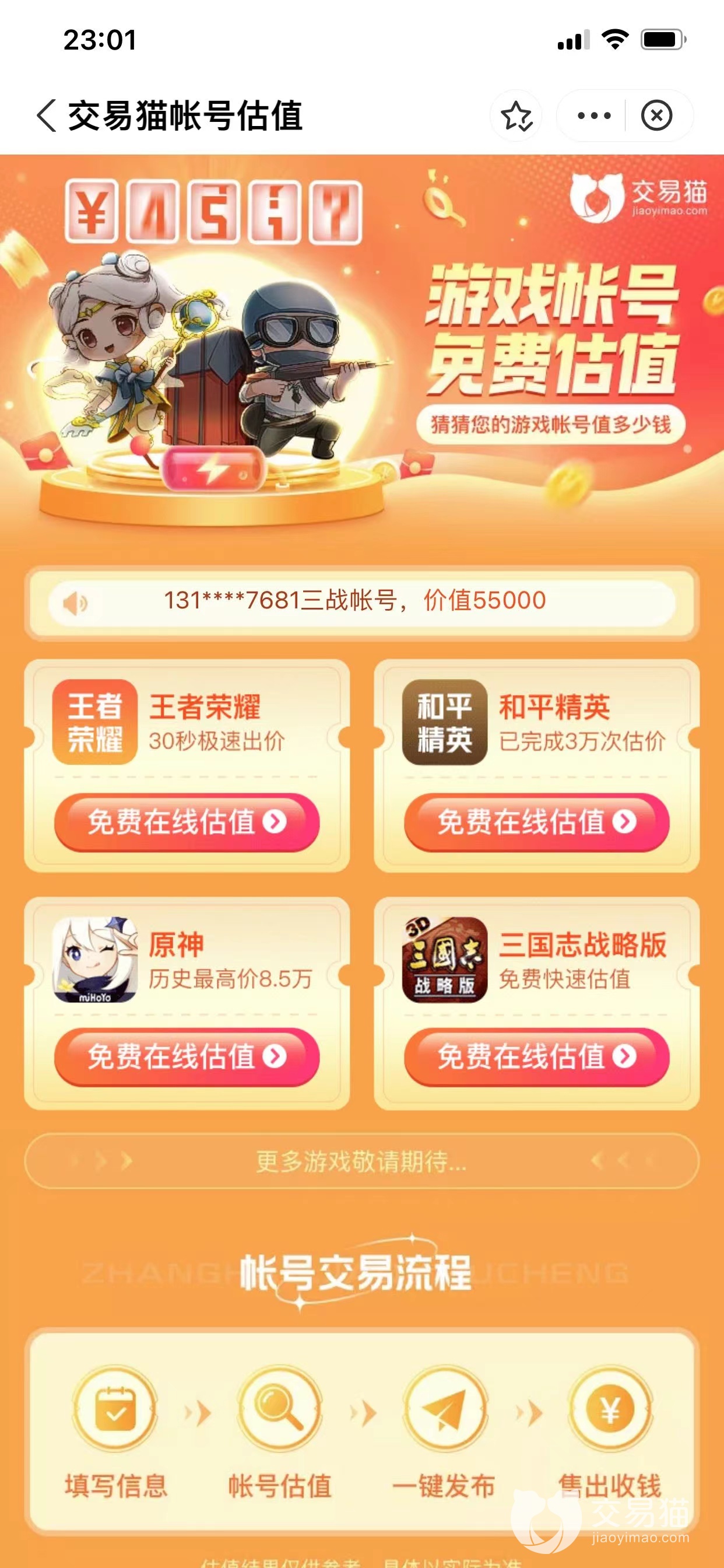 以上就是原神全角色账号值多少钱这个问题的具体解答了,小编认为小伙伴们可以去交易猫中体验看看,不仅能够免费估号,还有许多白菜价格的精品号源限时促销哦!