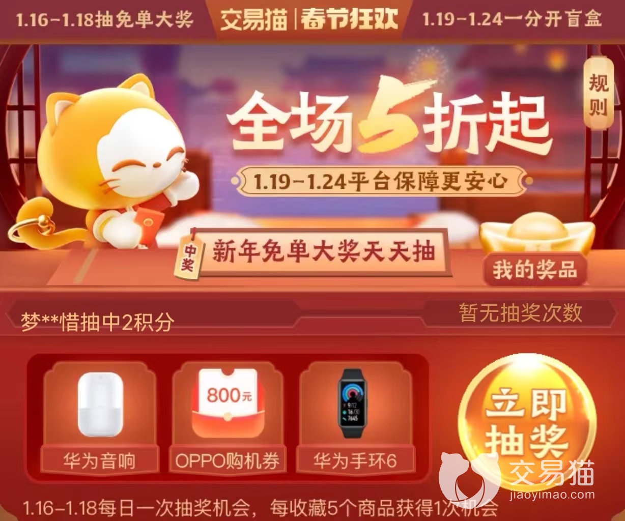 交易猫经常会推出各种优惠券活动,这种情况在节假日的时候比较多,有的是直接发放下单抵扣券,有时候是限量的需要玩家自己去抢,先到先得的形式发放,还有时候是开启抽奖模式,比如新春的这个活动奖励丰厚,但想要抽中可是没那么容易的。