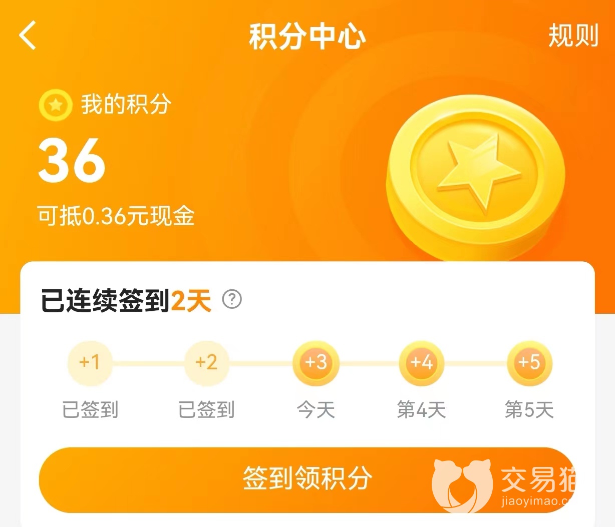 积分签到是交易猫中的常驻活动,只要玩家们每天上线点击右上角的签到就可以了,连续签到给的积分更多最多是一次5积分,积分可以下单时抵扣金额,1积分相当于0.01人民币,有时候还有积分抽奖活动推出,奖励是远比直接用于下单抵扣划算的。