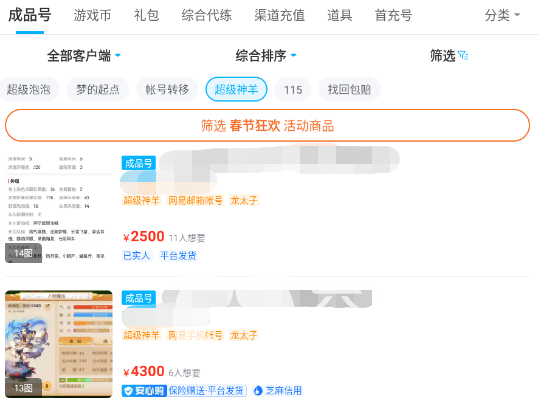 其次在进行账号购买的同时大家也可以针对性的挑选,交易猫中的各种账号都有,玩家可以根据词条来筛选,例如超级神羊的账号,大家就可以在其中进行选择,不止在职业的选择,在等级的选择上大家也可以在搜索栏中自由选择。