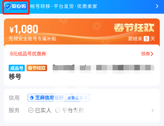 其次在这个平台上,大家可以利用小价钱购买到高级账号,有些优质卖家就是专门为大家上架这些优质账号的,所以账号的来源大家不用担心,安全性从头到尾都是有保障的,有安心购的账号还是很多的。