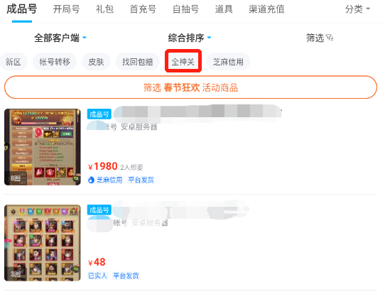 之所以推荐这个平台主要是因为这个平台上的游戏账号比较全,一些小游戏的账号交易猫都有,铁杆三国中的新区号也有,成品号中的各种角色都比较满,神级关羽很多账号都已经收集到了,大家想要获取关羽就可以找这种关键词来筛选。