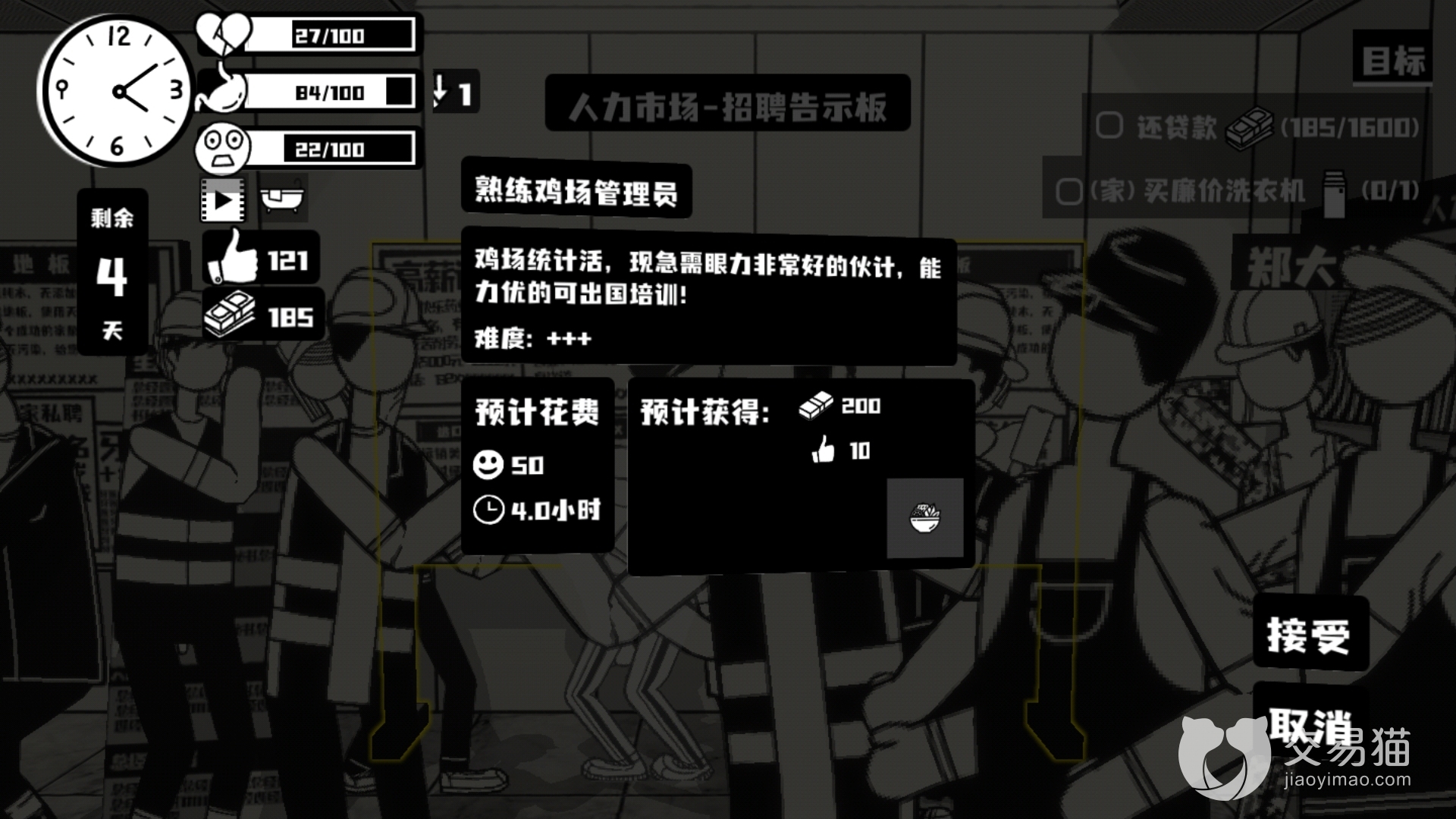 玩家在前期时,基本上都是到诚信人力资源市场找些可以日结的兼职来做的,虽然这些兼职的工资不高,但是的确可以解决燃眉之急,负担的起玩家日常的生活开销,譬如:饮食、娱乐以及睡觉的花费。而玩家们想要了解的增产鸡就是在人力资源市场所找的一项兼职里会遇到的动物,玩家要学会辨别这种动物才可以获得比较多的工资,否则就会有所失误,从而无法拿到应得的工资数目。
