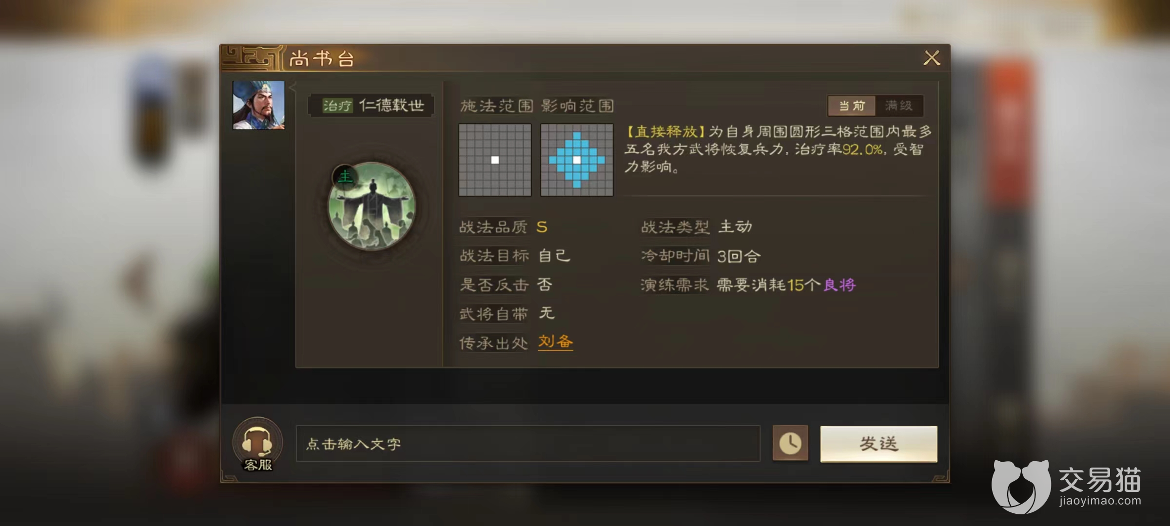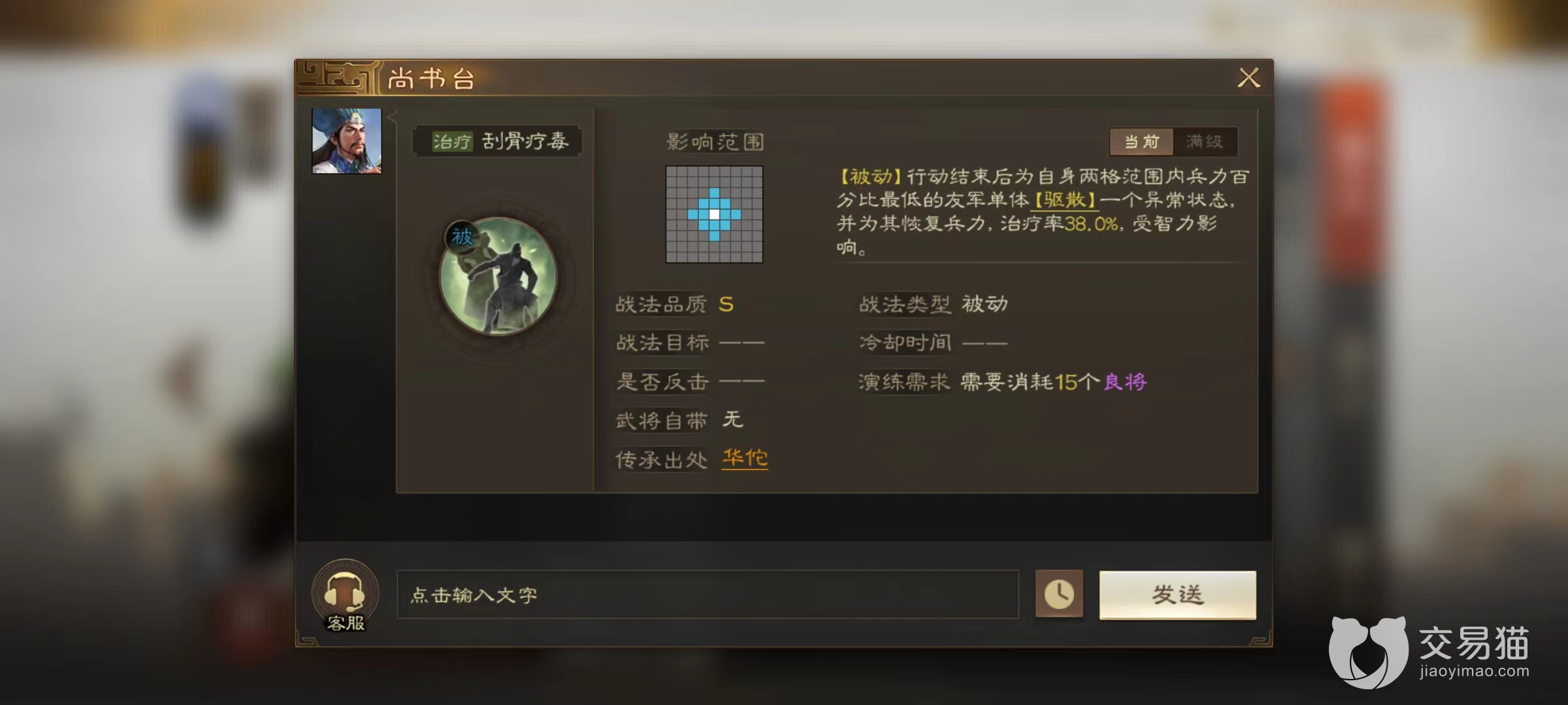 如果将两个效果产生的治疗量加在一起看,这一技能恢复量就相当可观了,尤其是在魏国阵营没有太多治疗情况下更是显出了其重要性。完全可以在PK中发挥出有效的治疗作用,后毕竟后续持续恢复并不占用回合数。所以不要因为属性方面差一些就放弃使用,一定要结合战法来看。在另外两个技能的选择上,小编的建议是直接上橙色战法,例如刮骨疗毒和仁德载世都是很好的选择,或者是紫色的简亮和坐守孤城也适合选择。