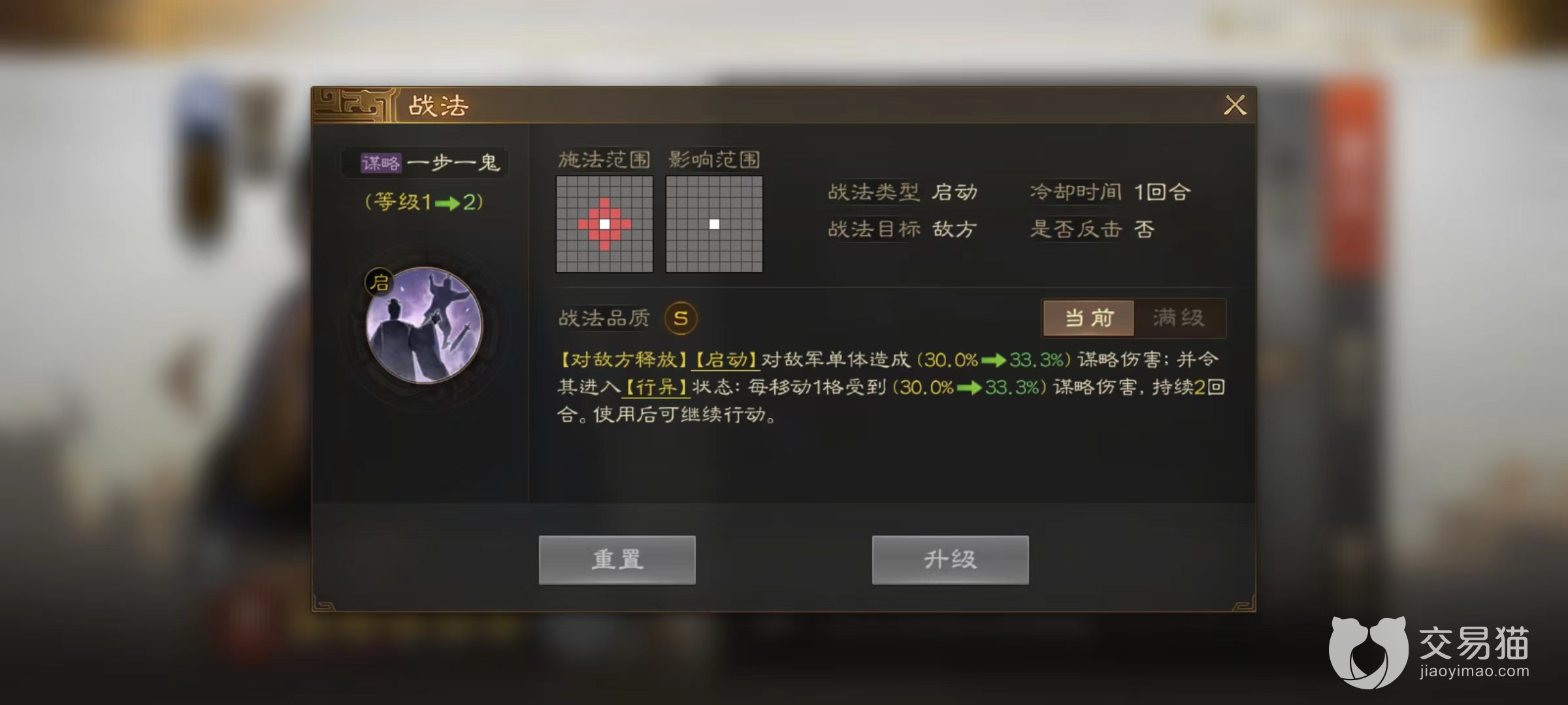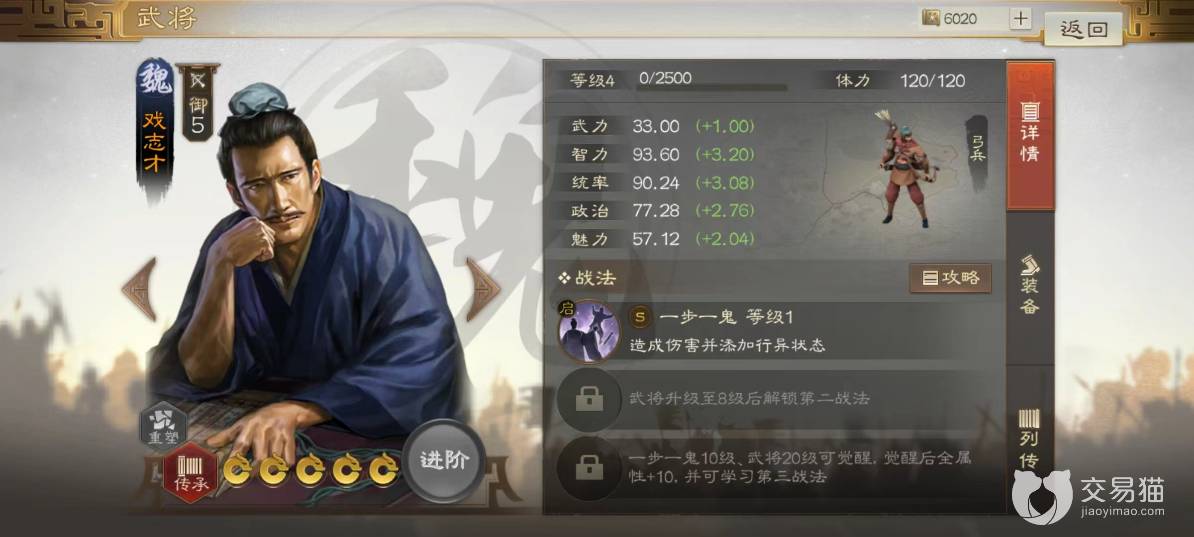从属性来看智力虽然没有达到一流水准,但是也完全不影响输出。自带战法一步一诡,当对敌方释放时可以造成一次单体谋略伤害,同时使伤害目标进入到行异状态。此状态能够很好限制对方的移动,目标只要移动一格的范围就将受到一次伤害,对于一些移动力超高的骑兵型武将更是有着极大限制作用,冲锋距离越长,受到伤害也就越高。并且此技能在使用后可以继续行动,不占用回合。