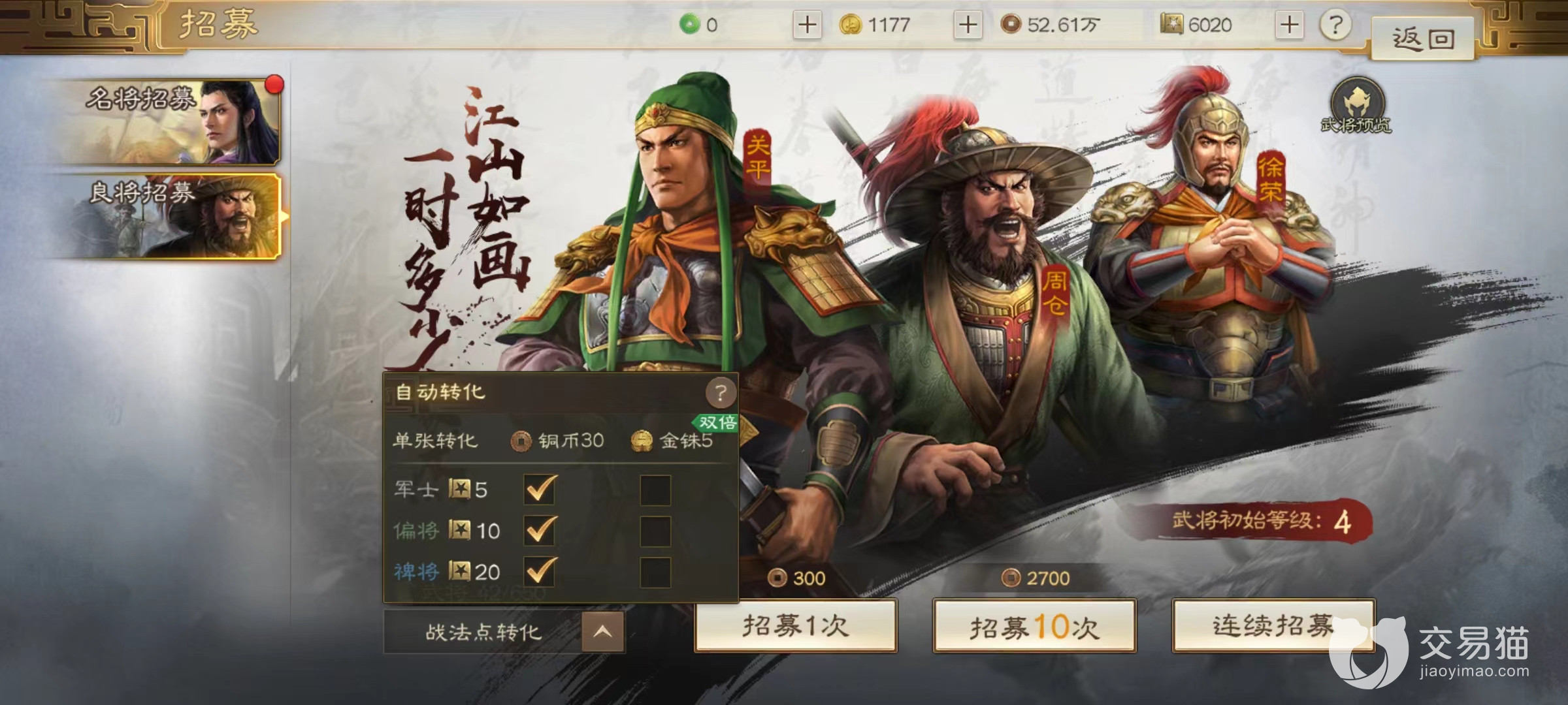 对绝大多数平民玩家来说,金珠往往需要用于抽取橙色或紫色武将,所以不能浪费到这里,土豪玩家可以选择。武将品级越高转化而来的点数也就越多,一般蓝色品质武将如果使用铜币转化可以获得20点战法点,使用金珠则能翻倍达到40点。虽然单次看来并不高,不过数量多了之后总量就很可观了。另外再进行招募时选择良将招募可以直接选择战法点转化,这样就能将抽取到的低级武将直接转化过去,就无需再手动操作,更加简单推荐选择。