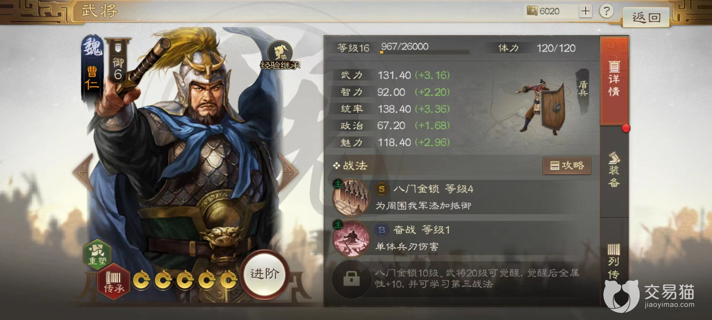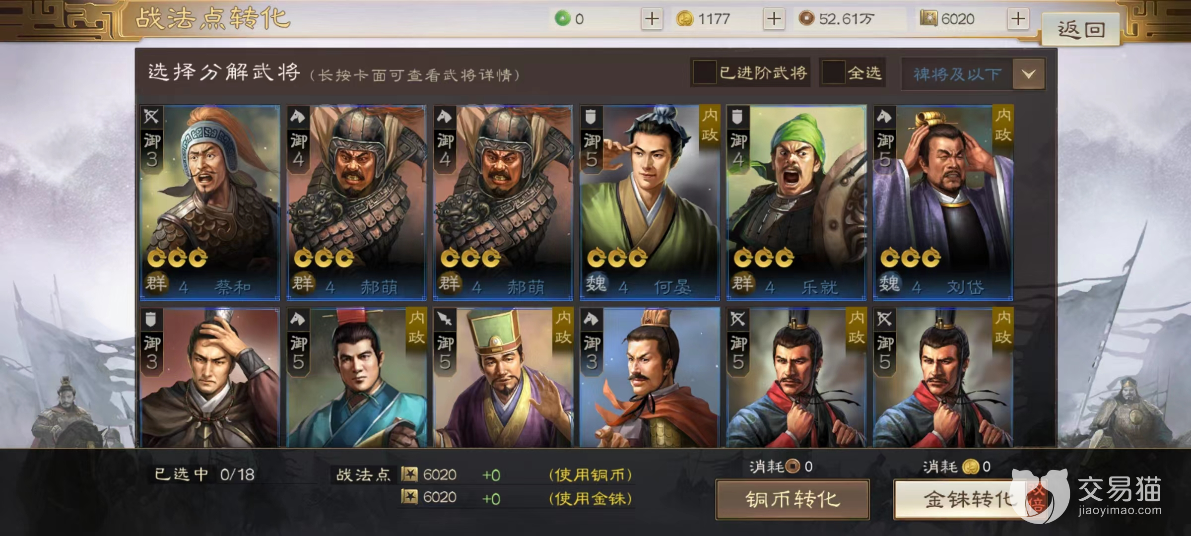 选中想要提升的角色,然后可以看到所有自己携带或已经学习的技能,点击选择后通过升级就可以提高等级。要想进行等级提升最关键就是点数。从武将详情右上角看到相关道具数值。要想获得主要通过战法点转化,平常抽取到低品质或是使用不到的角色都可以通过转化方式将其分解得到点数。在转化时候有两种不同方式,分别是铜币转化和金珠转化。如果使用金珠转化则得到战法点数是铜币转化两倍,是否选择就要看手中有没有足够多货币,或者是当前对战法点数需求程度来决定。
