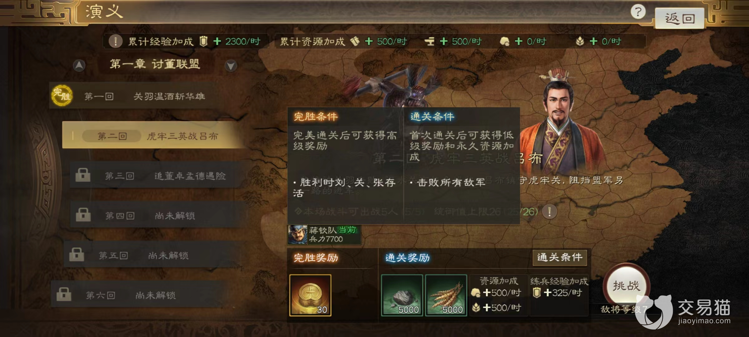 每一个关卡要想达到完胜都有不同的要求,有些是限定了出战的武将势力,而有些则是限制了数量,还有限制了出战武将的统御值总数等。只有按照要求去战斗,并且在没有超过要求下获得胜利才可以激活完胜。主要是大量金株可以用于抽取顶级武将。此外在通关奖励中除了一次性资源之外,还将获得产量加成,在演义界面上方就能看到累计通关所获取的资源加成和经验加成等。