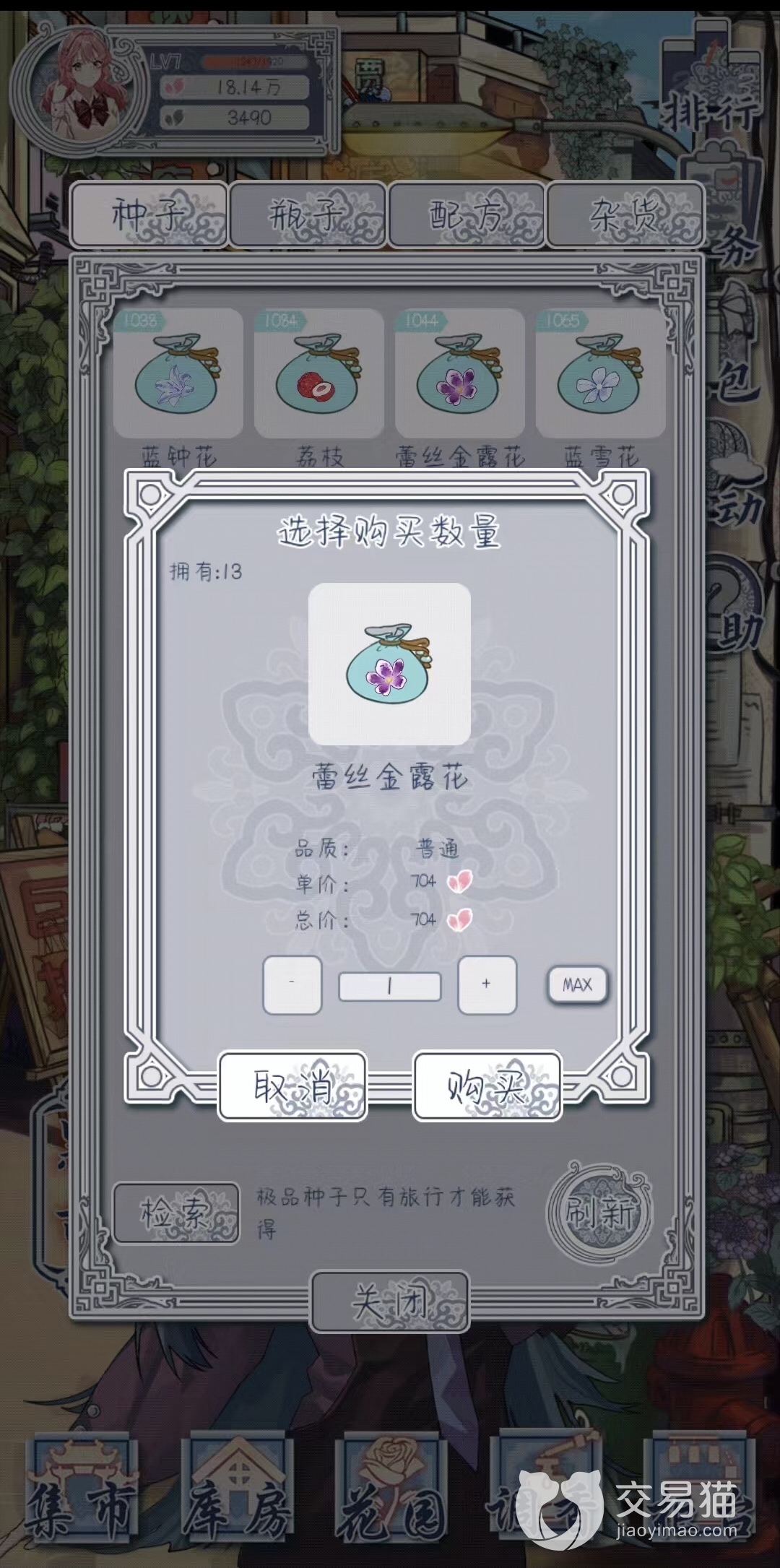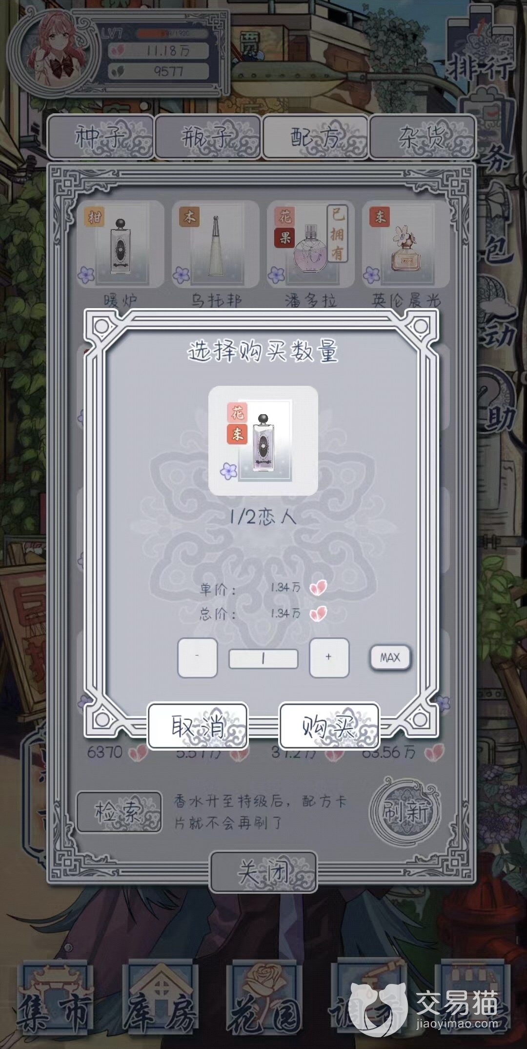 我们首先要到集市去购买这个香水的配方,购买需要1.34w粉花瓣,价格对于前期的玩家来说会比较高,但是它售出价格是1136点粉花瓣,要赚回配方钱是非常快的。集市中还有很多香水配方购买,玩家可以多去集市中看看。