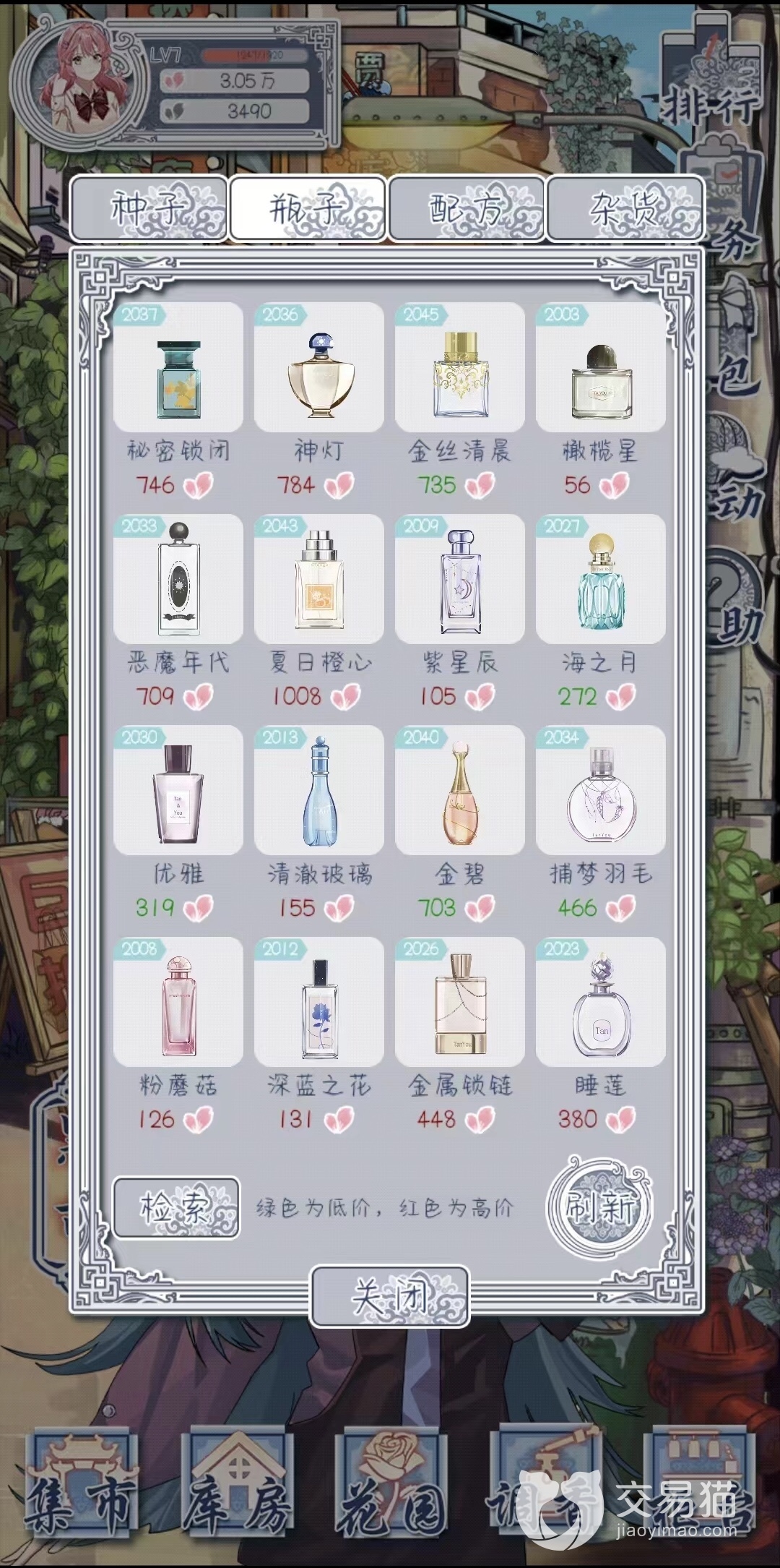 1/2恋人配方香水需要瓶子“恶魔年代”,在商店的价格最低是380左右,最高会到820多,日常价格会在五百到六百之间浮动,但是这个区间的价格并不划算,如果可以刷到比440低的价格就是非常划算的了,大家可以放心购买。