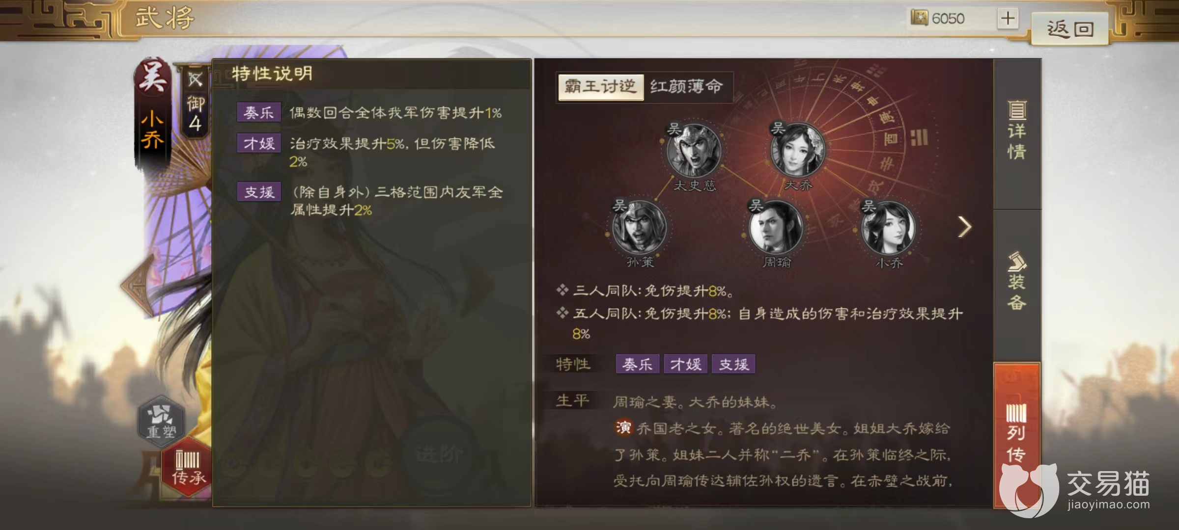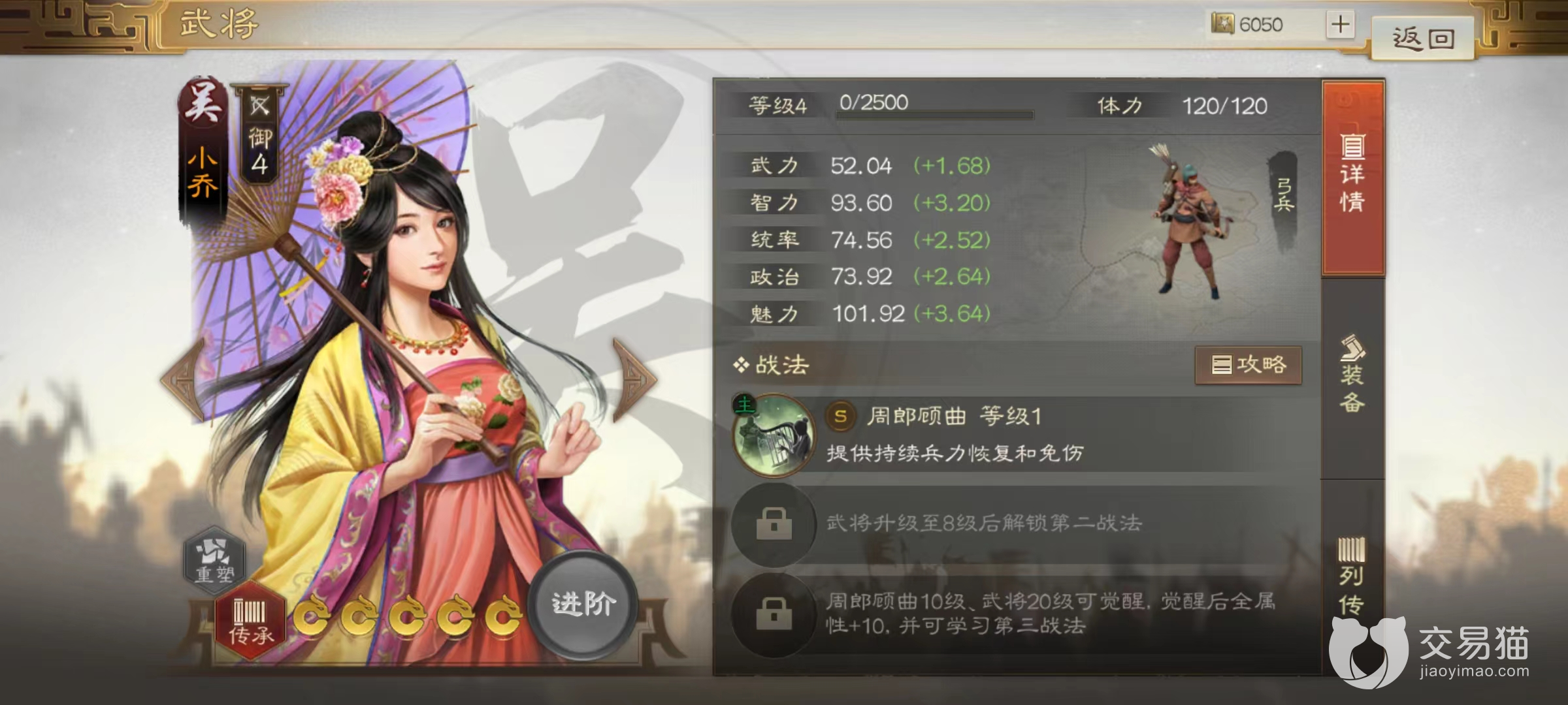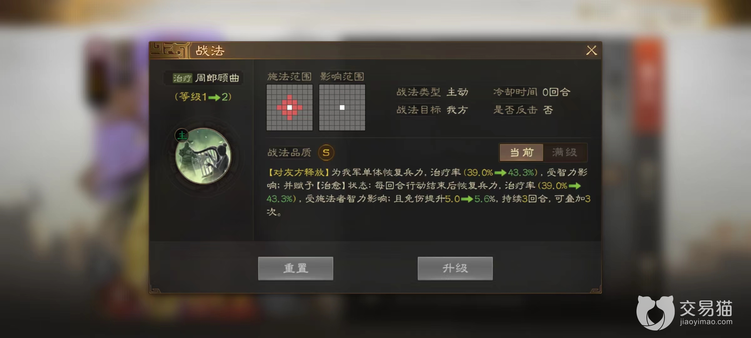 在选择之前,需要先搞清楚对应武将定位,这样才能不浪费珍惜的技能,从属性来看智力和魅力相当高,这样就使其拥有了出战实力,后退也能成为内政型武将发挥作用。自身战法周郎顾曲,为单体武将恢复兵力,并且对治疗目标还能提高免伤属性,最多能持续三个回合,免伤可以叠加最多三次,达到满级时最高为30%提升数值,这已经是非常可观的防御型手段,为前排突击武将带来很多生存帮助。在效果上,免伤要比防御更好一些,这也是此技能最大的用处。