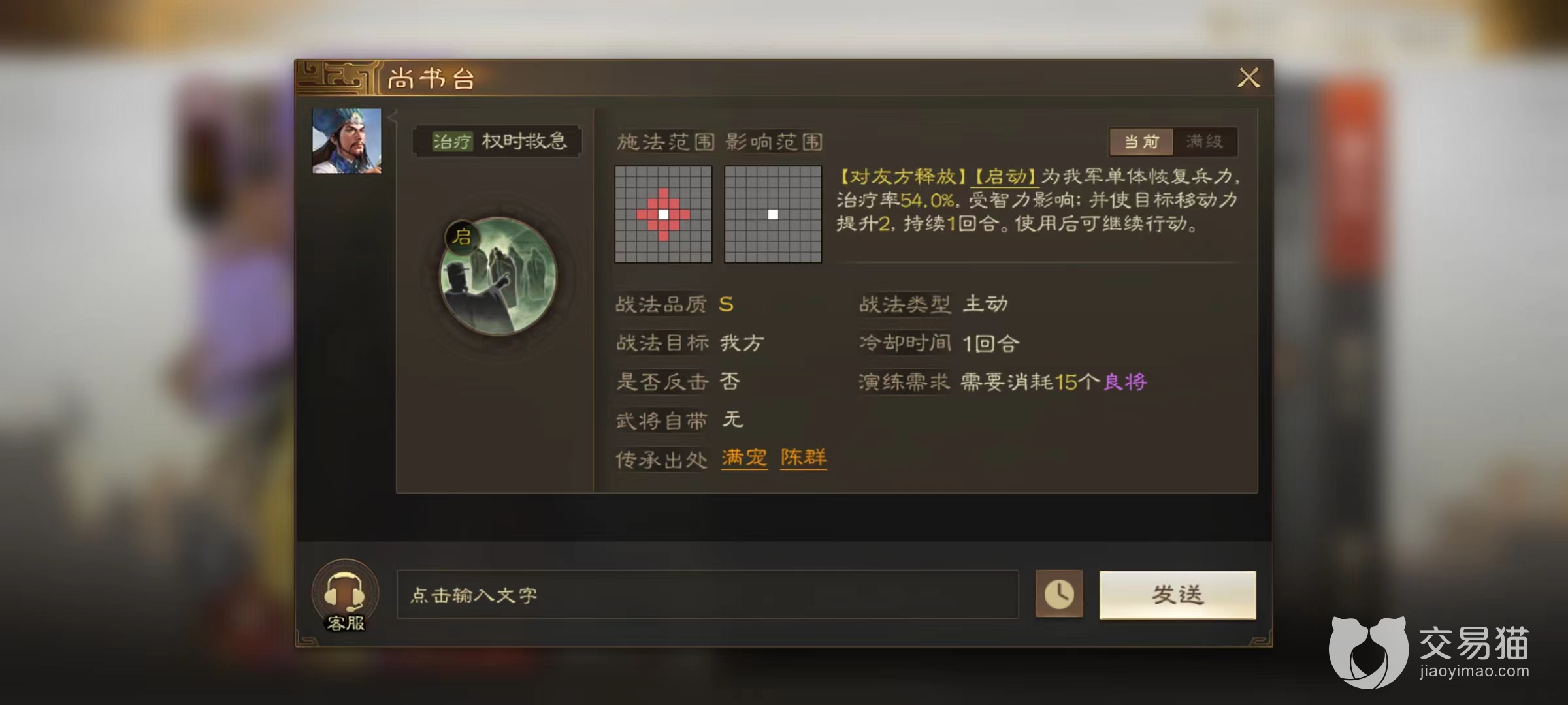 如果走辅助单核路线,可以将其中一个替换为权时救急,同样是单体加血技能并且提高目标移动力,使用后不耽误接下来继续行动。移动力提高对于骑兵来说有锦上添花效果,对于弓兵、枪兵等兵种能够很好弥补缺陷,使得在场上调动更加得心应手。在阵容选择上最好同样是吴国势力,太史慈、孙策等这两名角色都是单体输出极强人物,有了这样的辅助可以放心厮杀。