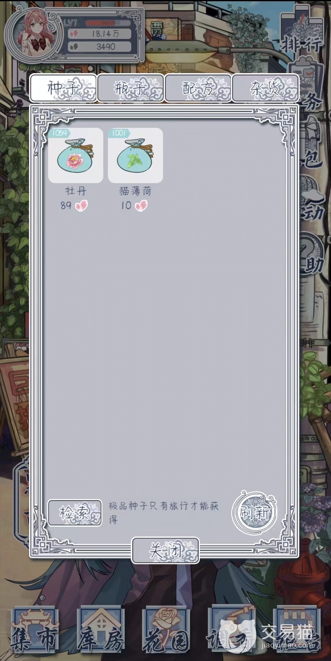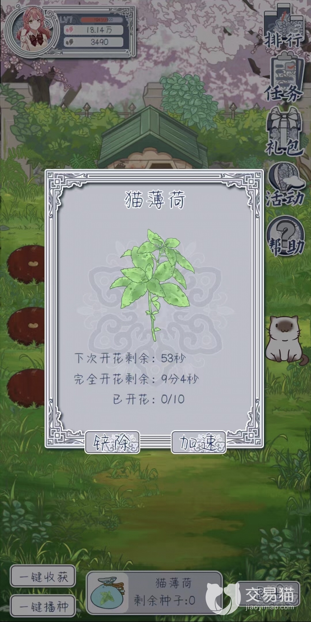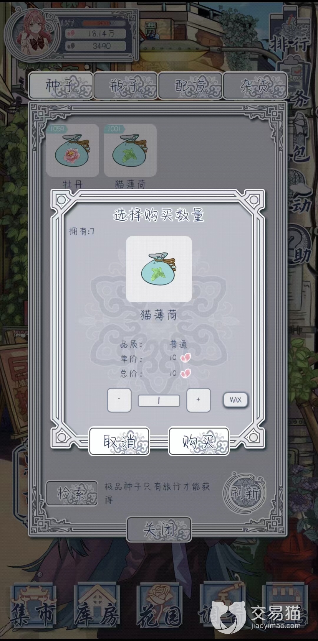 首先,我们要知道游戏中猫薄荷是无法比较获得的,要先在集市购买种子,再在花园中种植,才能获得猫薄荷。猫薄荷在集市种的价格是10粉花瓣,价格非常得低,大家不用担心没有钱买。