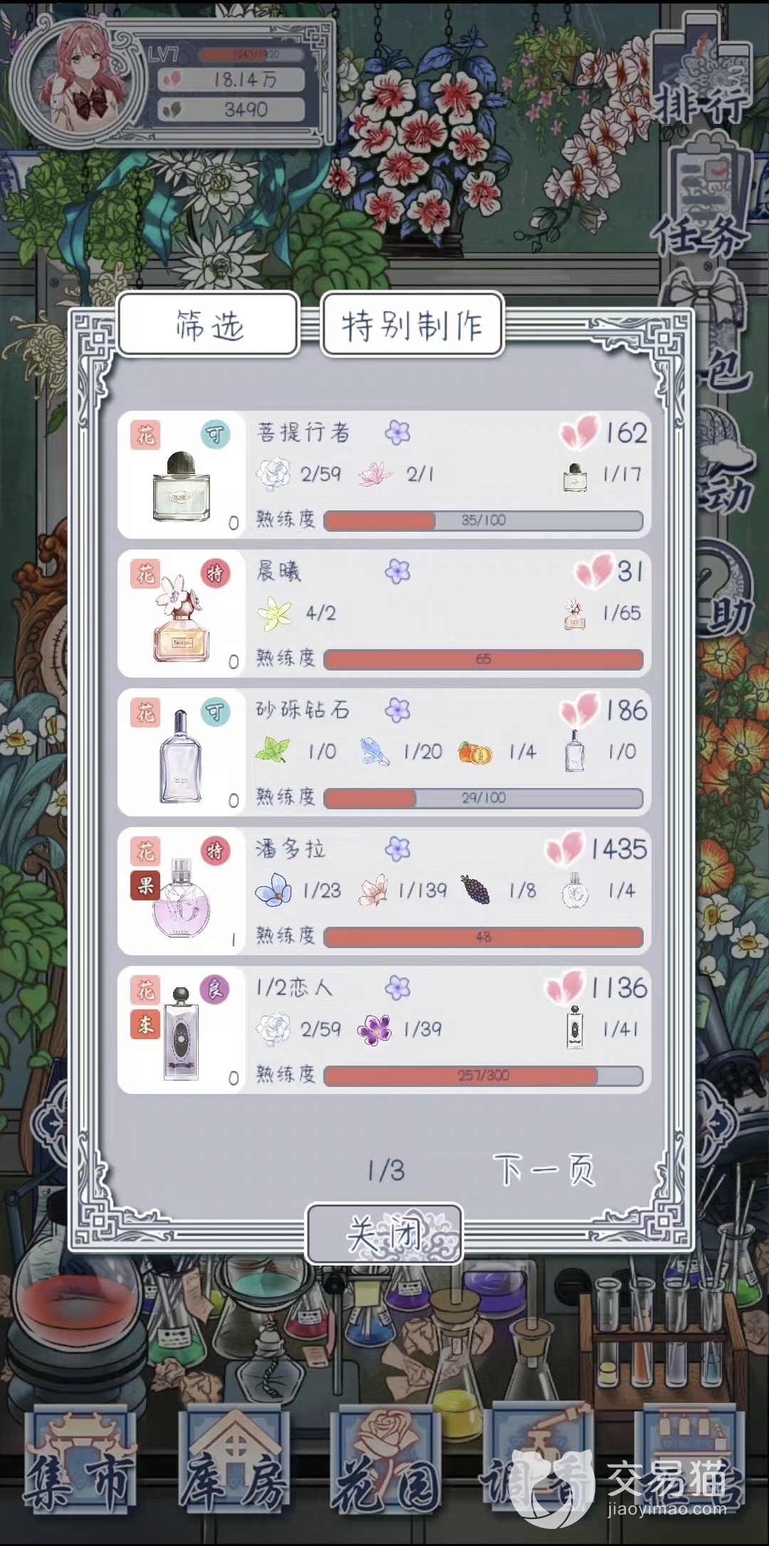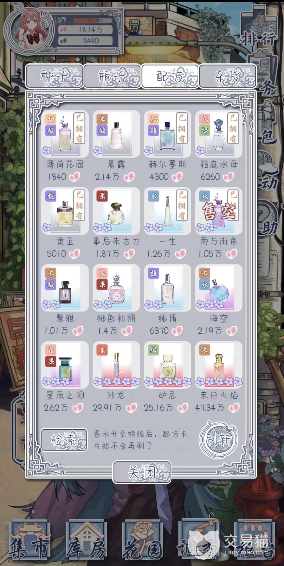 瓶子商店每次提供购买的香水瓶子是随机,如果这一页中都没有你想要的香水瓶子,你可以花费500点粉花瓣或是看广告进行刷新,刷新后香水瓶子的价格也会变化。香水瓶的价格变化没什么规律,但是会有个最低价和最高价,两者之间差价不会超过500,所以玩家可以多留意日常刷到最低价是多少,在接近最低价时就可以购买了,不要太执着在最低价时购买。看到最低价的时候,我们可以买多一点,香水瓶是制作香水必须的材料,一般不会浪费的。