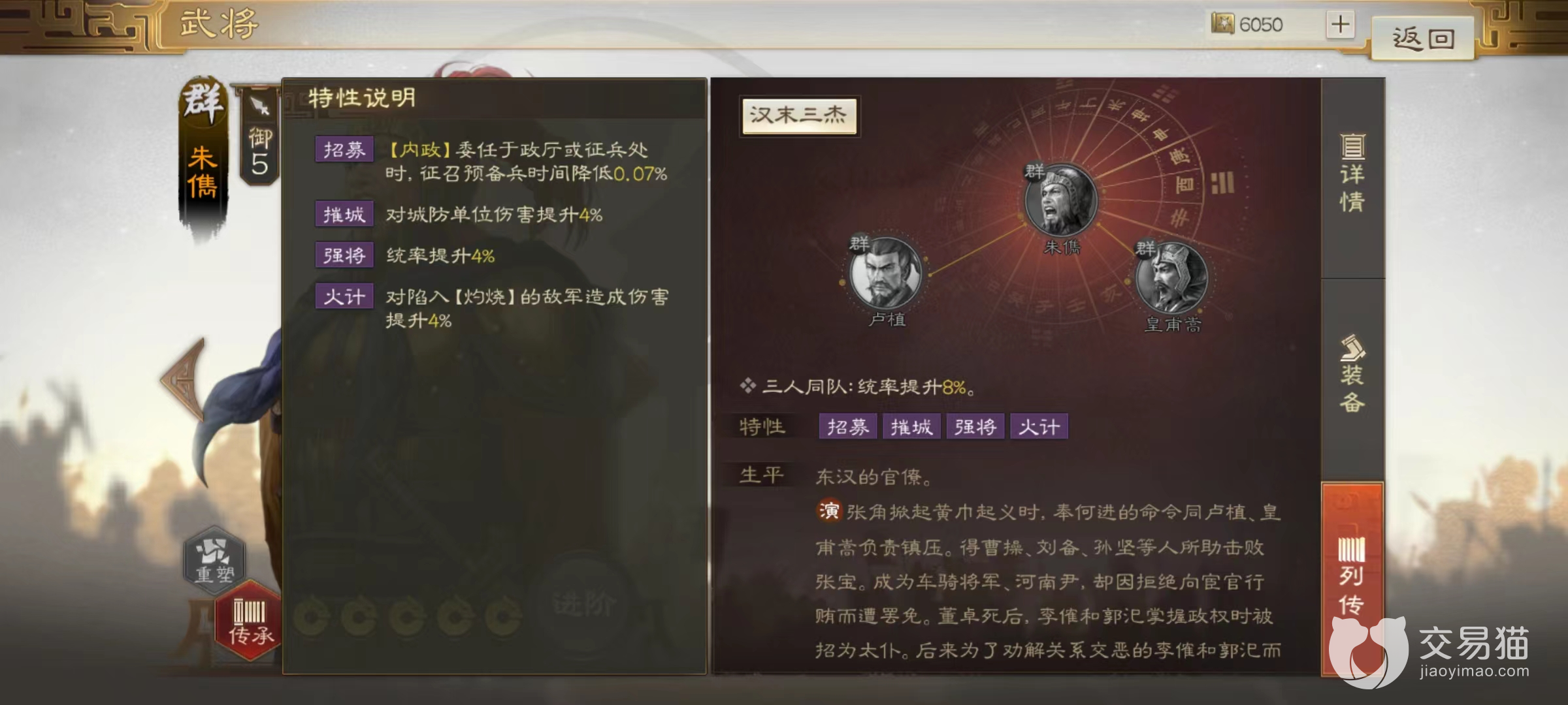 但也因为自身属性和战法选择比较中庸,很难在主力队伍上混上位置,所以小编对他的定位就是走辅助队伍路线。搭配上同样比较中庸的卢植和皇甫嵩就可以出战了,这三人能够提高统率值强化生存能力。而且毕竟都是橙色武将,在战力上也不会低太多,完全可以作为实力非常雄厚的二队使用。
