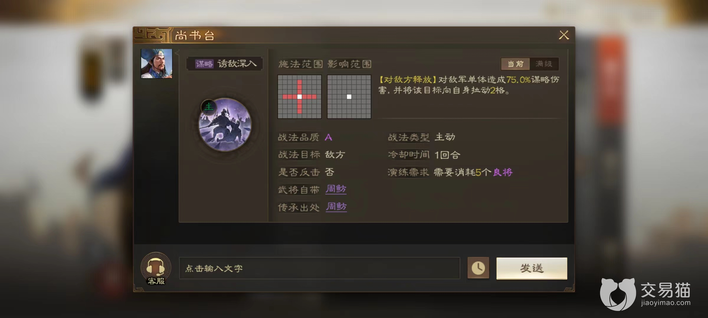 为了将自身战法的效果最大化,另外两个搭配上小编推荐选择诱敌深入和料事如神,这两个都属于紫色品质a级技能,在获取上非常简单。所以在很短时间内就能搭配成型也不占用太多资源。但是在搭配效果上却非常得当,料事如神可以在造成群体伤害基础上降低对方输出能力,持续两个回合。诱敌深入选择敌方单体为目标,将其向自身方向拉动两格距离,拉过来之后自身携带的技能效果就能生效了,这样也能破坏对方阵型。