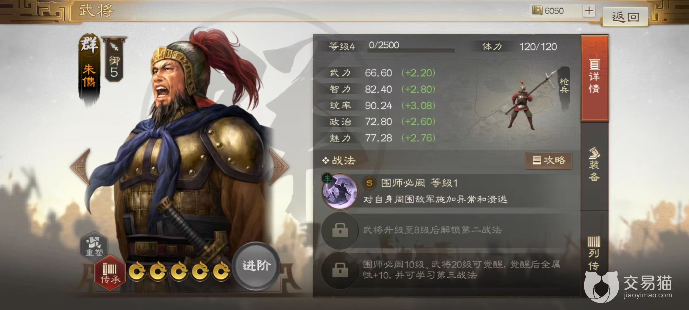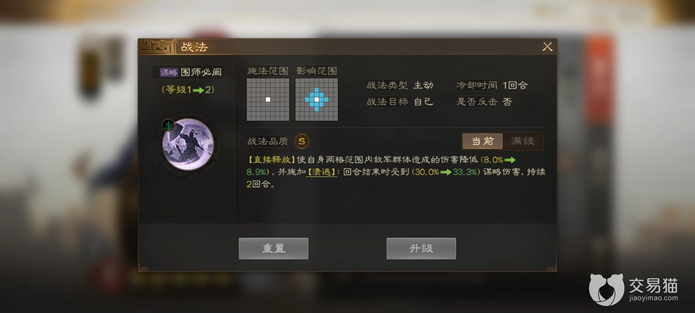 在属性方面没有特别需要介绍的地方,统率值还算比较出色,其他就非常低,接下来再看战法围师必阙,降低自身范围内其他敌方武将伤害,并且为其附加溃逃效果。在每个回合结束后都受到持续伤害并且无视防御。这属于将减益状态和持续伤害附加在一起。最关键是两个技能效果都和属性无关,这样完全能够当做一个高级工具人。不依赖于属性和成长也能发挥出很好作用,如果能冲进敌方群体中利用降低伤害效果削弱对方输出,对团队来说也是很有帮助。