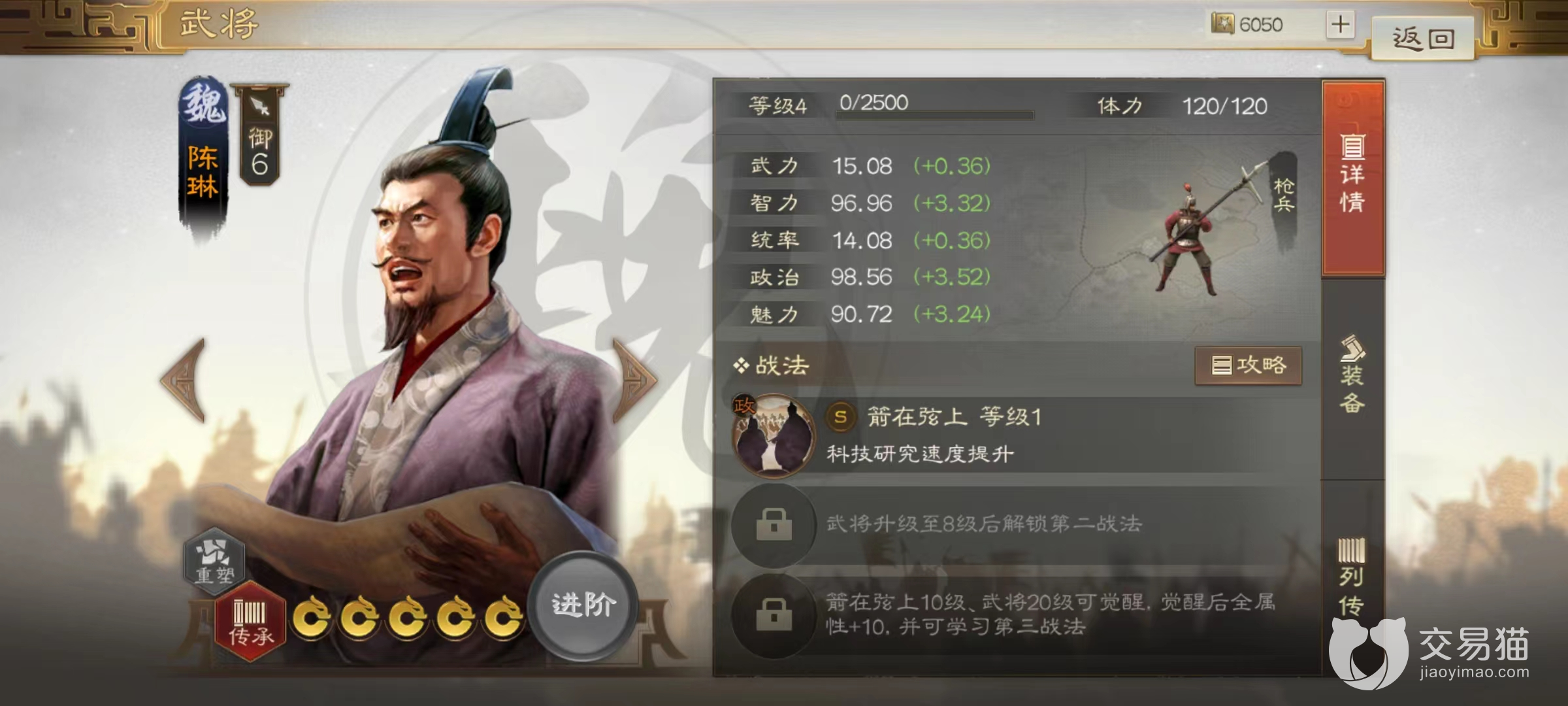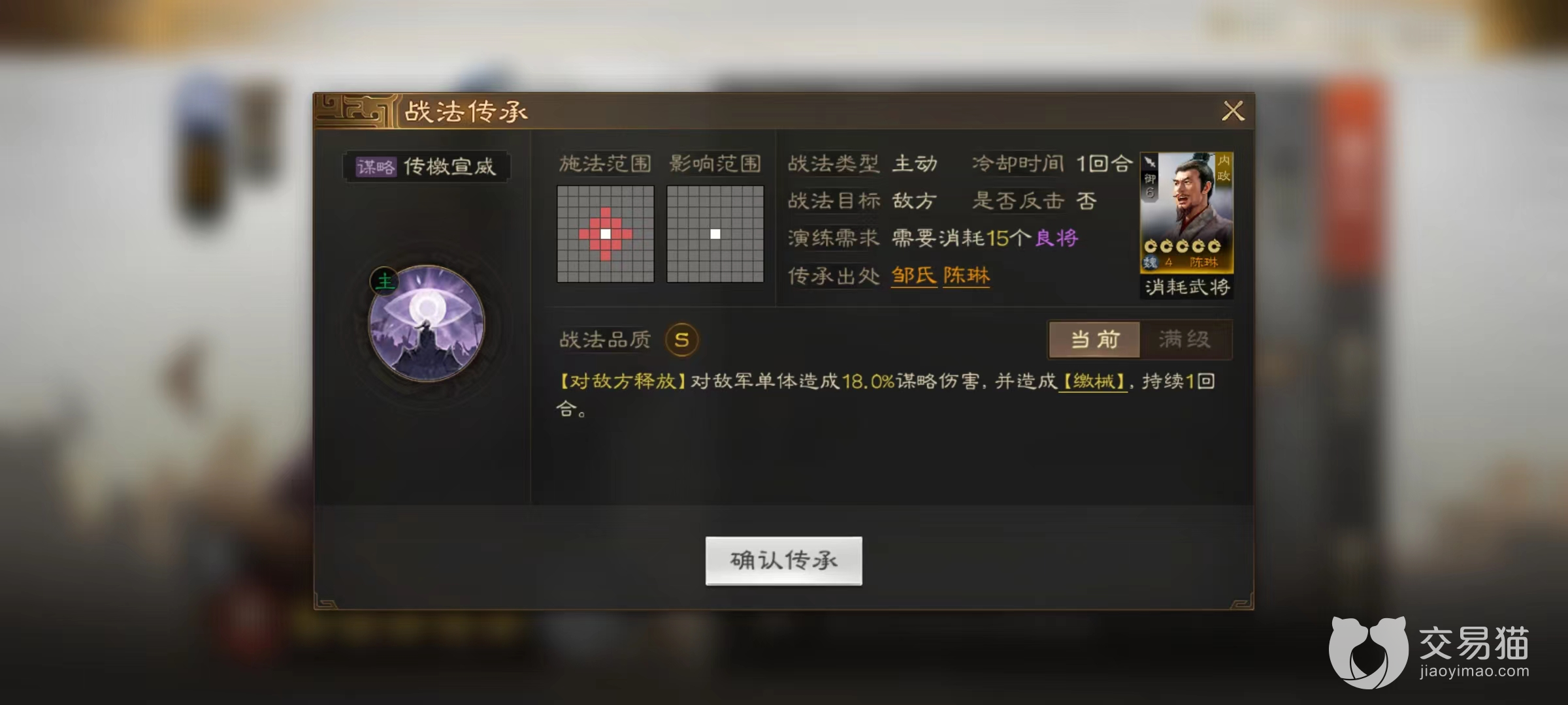 虽然在两个职位上都有相同效果,但是在选择上还要根据手中其他武将来定,如果有更合适人选则将其安排到研发使上就可以,如果暂时没有可以先去当主政官。当抽取到第2张武将卡牌的时候无需再为其升阶,而是直接传承掉获得一个很好用的战法传檄宣威。这是一个可以对单体造成谋略伤害,并且附加缴械状态的技能,很多谋臣型输出选择,获得传承也是内政型武将很重要的一个用途。