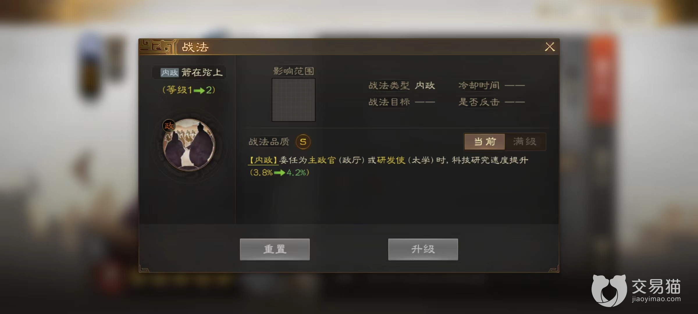 作为内战型武将自然是不会上战场,所以即使有很高智力值也只有可能在前期临时充当一下,后面肯定要马上换下来,毕竟自己所擅长方面在政治和魅力上。尤其是拥有很好的政治属性及成长,更使其成为了主政官等各种官职首选,自身战法箭在弦上,当成为主政官或者是研发史时候提高科技研究速度,当技能达到满级时研究速度提升为7.5%。