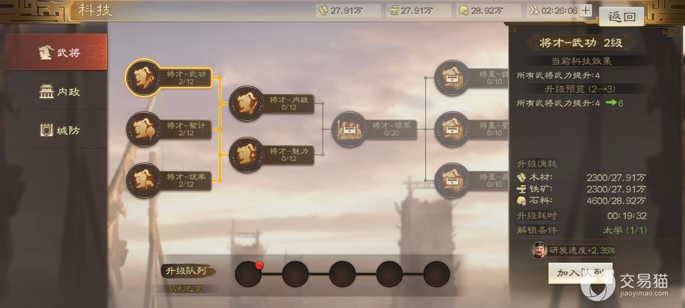 这里简单科普一下科技研究速度所带来的优势和含义。在主城建设中,除了建筑物升级之后能够带来加成之外,研究科技也是很重要一项。分为武将、内政城防等不同类型。武将科技则是提高将领们各项属性,带兵能力和其他方面,和战力息息相关。内政科技则是能提高各种资源产量,城防是城池防御能力。这些都需要逐步提升,能够发挥重要作用。在后期要想提升非常消耗时间,而提高了科技研究速度自然也就能比其他玩家更快获得高科技,在战力加成上也会很明显。