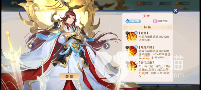 如果要牵制敌方前排那么天帝一定是最佳人选,这个角色作为法术输出的翘楚,立绘原画也非常的帅气,还可以对前排角色进行概率眩晕,并且伤害倍率还算可以,即便是前排坦克一直被这么打也吃不消,羁绊对象方面嘛,自然是天后,这个不用猜也知道,自身可以和天后搭配增加免伤和回怒。