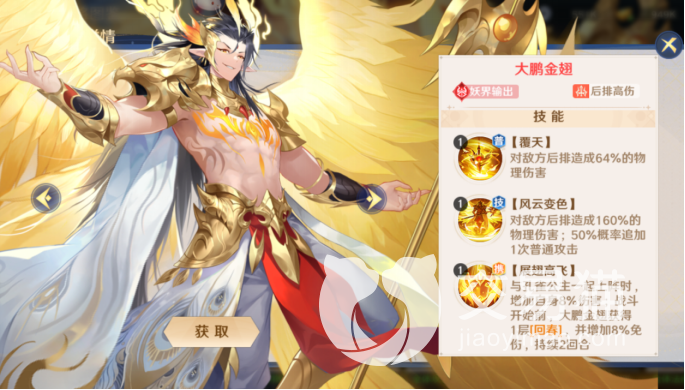 大鹏金翅是一名非常强力的后排杀手,所有技能都能打到后排,这能让敌方的输出核心瑟瑟发抖,并且大招后还能有几率增加一次普通攻击,另外像这种普攻有特殊机制的也可以走一个普攻流的玩法,一直给对手后排压力。另外他还可以通过与孔雀公主的搭配可以增加伤害和免伤。