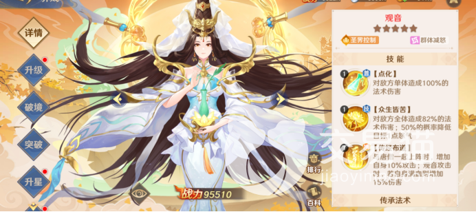 首先要推荐的是观音,这个角色普攻对单大招对群,并且还能有效降低敌方的怒气,这个减怒效果可是对群的哦。在拖慢对手放技能的节奏这方面,可以说是非常好用,并且在数值这一块也很可观,所以强度不容小觑,玩家可以配合唐僧来触发羁绊进一步增加伤害。