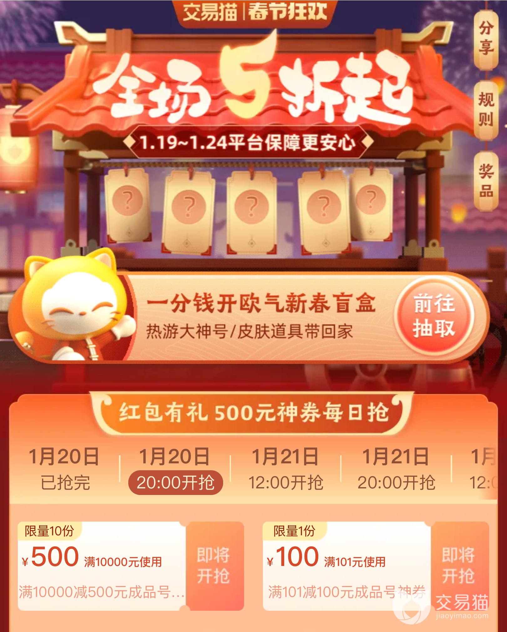 交易猫不定时举行活动为广大用户发出打折卷或满减福利,春节期间还能进行一分钱抽奖活动,开盲盒将热游成品号带回家,同时也能通过每日签到来获得金币抵部分现金。