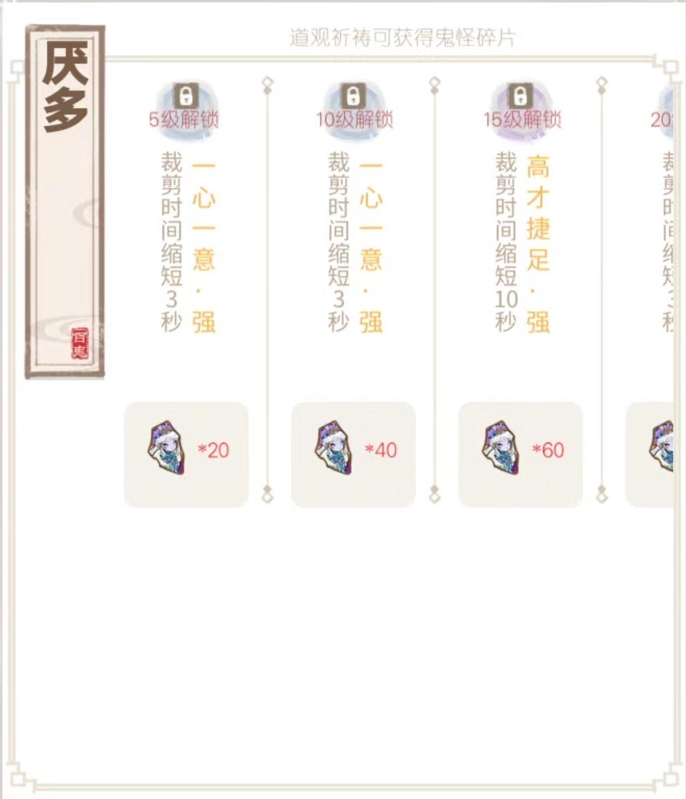 关于养成方面小编还有几点知识需要强调,新手玩家一旦误入歧途就会导致重大损失,第1个就是在解锁鬼怪天赋时候千万不要使用碎片直接喂养,这样无法解锁反而浪费了碎片。需要在天赋栏中点击解锁按钮才能解锁成功。第2点是在解锁天赋等级时候完全不用从低到高开始,可以跨越式解锁例如直接攒够碎片升级高级天赋更加合适。最后就是关于妖力值设定,这项属性虽然影响鬼怪工作时候的效率和成功率,但是有一部分无需提升,天赋对他们来说更加重要。