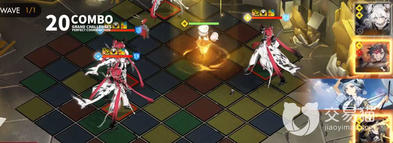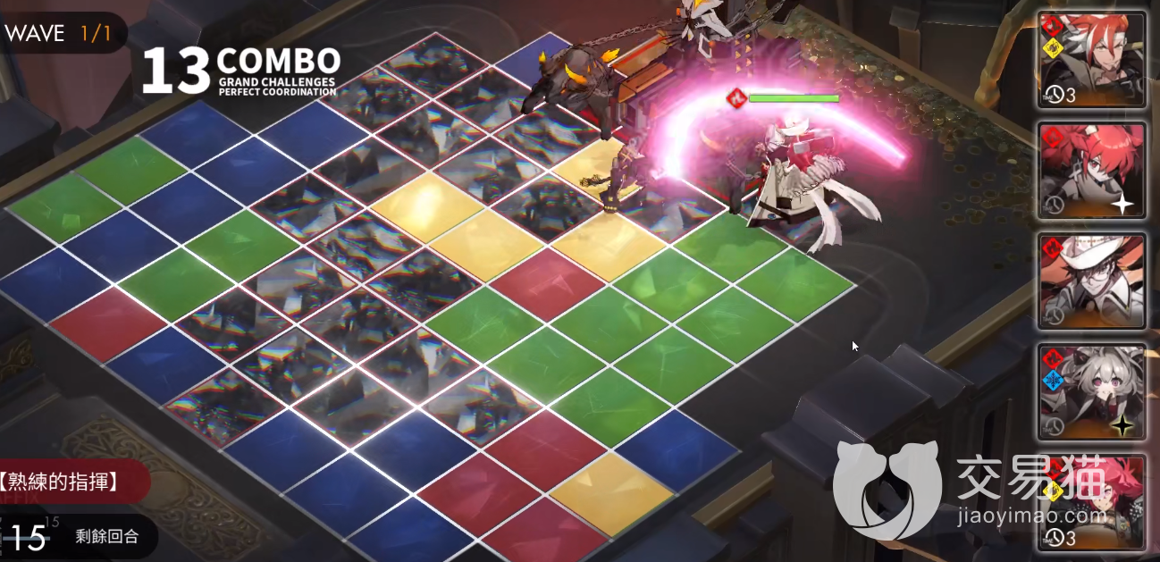 游戏的基础玩法就是组成一个5人小队进入地图,再一个长和宽都是9格的四边形四色棋盘上行动,每回合行动一次,拖动地面连线同色的格子,角色每路过与敌人相邻的4个格就会攻击一次。